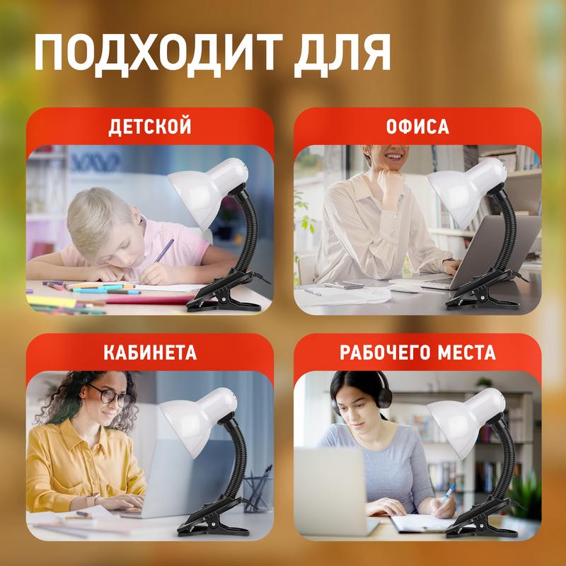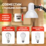 | Функциональные преимущества | Светильник может использоваться с лампой накаливания, компактной люминесцентной лампой (КЛЛ) или светодиодной (LED) лампой. Прочная прищепка. Металлический плафон. Наклон и поворот плафона в любом направлении. |
