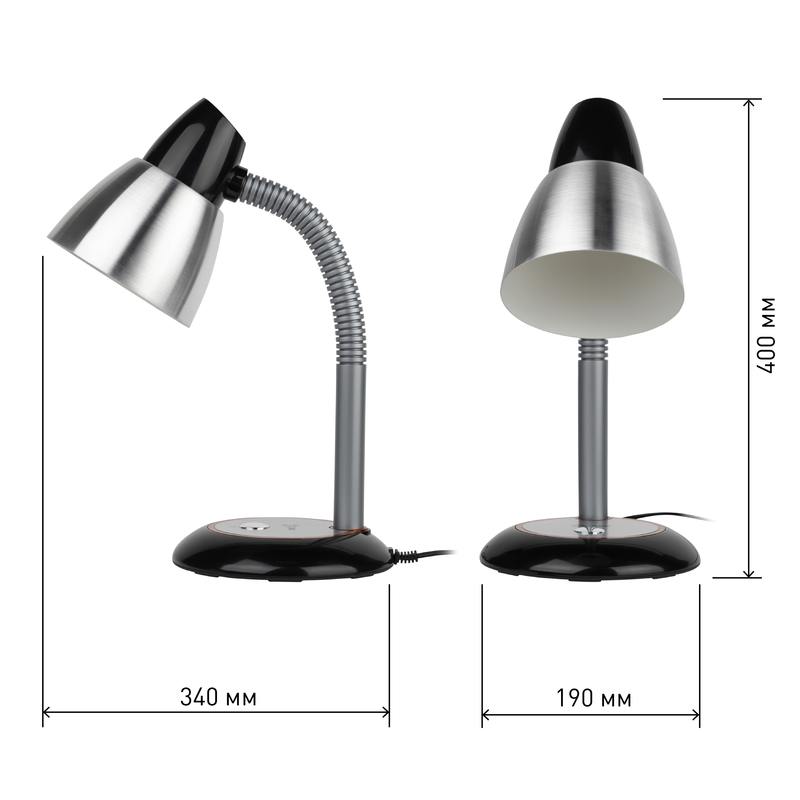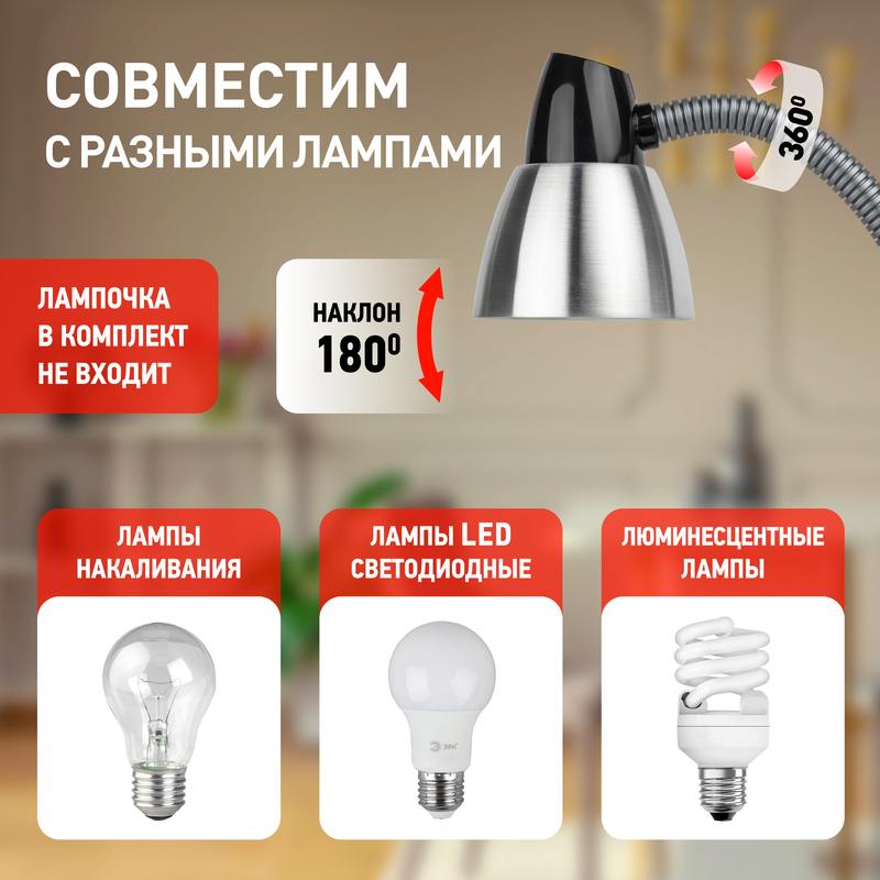 | Функциональные преимущества | Светильник может использоваться с лампой накаливания, компактной люминесцентной лампой (КЛЛ) или светодиодной (LED) лампой. Устойчивое металлическое основание. Металлический плафон большого диаметра для комфортного рассеивания света. Наклон и поворот плафона в любом направлении. |