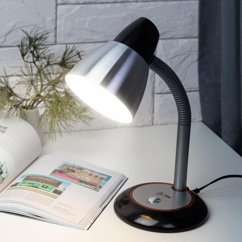 Настольный светильник ЭРА N-115-E27-40W-BK может использоваться с лампой накаливания, компактной люминесцентной лампой (КЛЛ) или светодиодной (LED) лампой. У светильника классический солидный дизайн, устойчивое металлическое основание. А также металлический плафон большого диаметра для комфортного рассеивания света. Направление света регулируется наклоном и поворотом плафона в любом направлении.