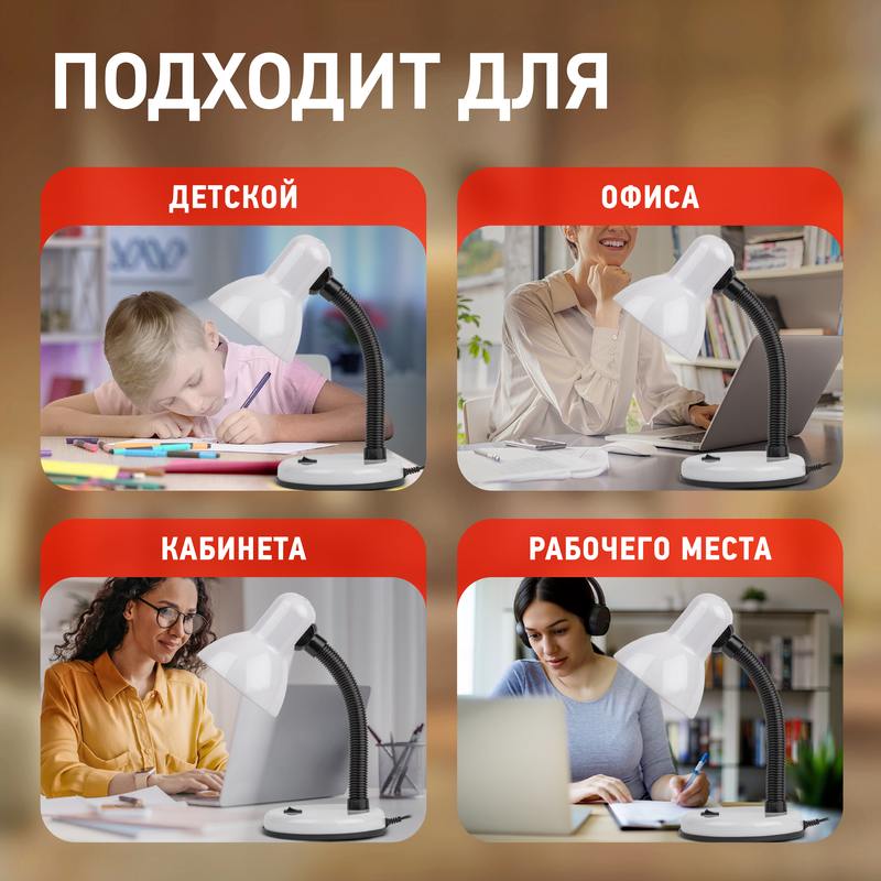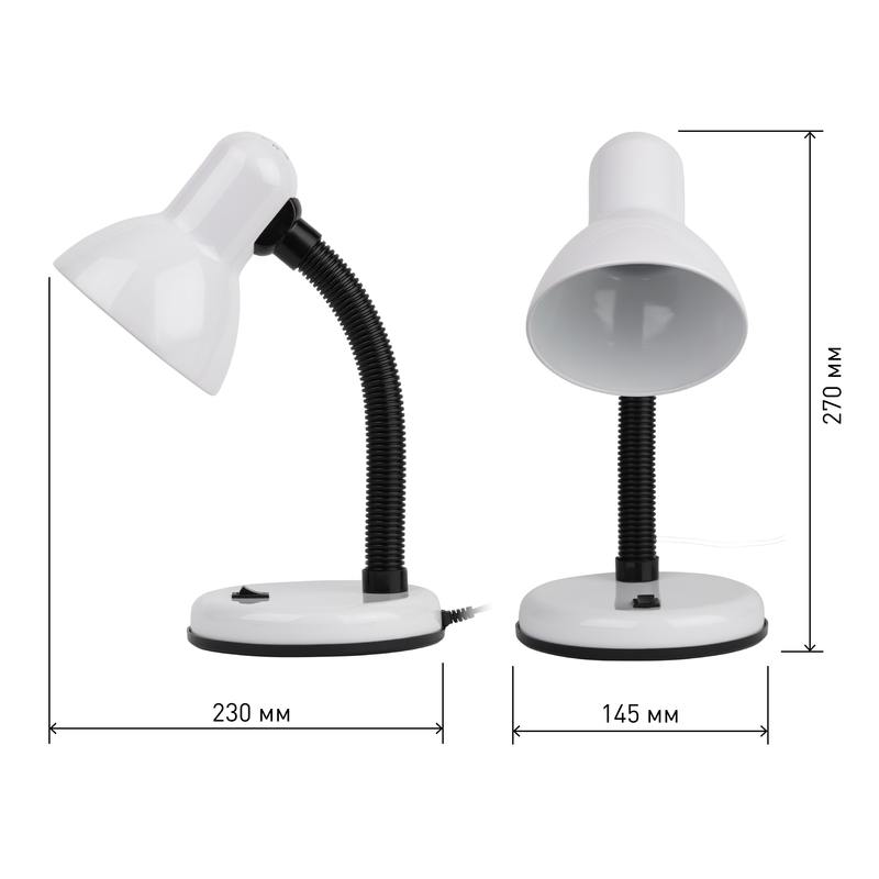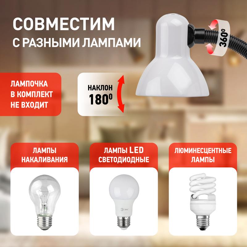 | Функциональные преимущества | Светильник может использоваться с лампой накаливания, компактной люминесцентной лампой (КЛЛ) или светодиодной (LED) лампой. Устойчивое основание. Металлический плафон. Наклон и поворот плафона в любом направлении. |