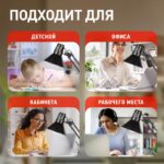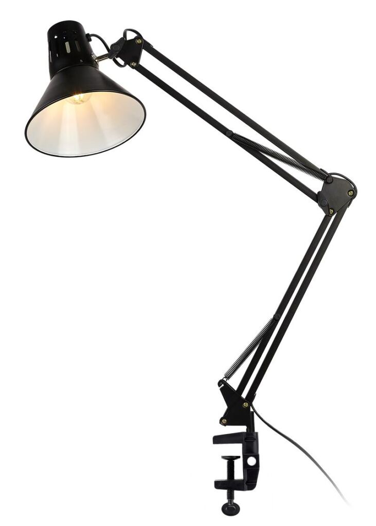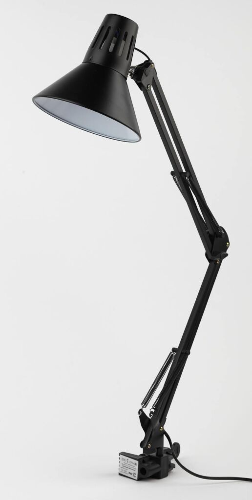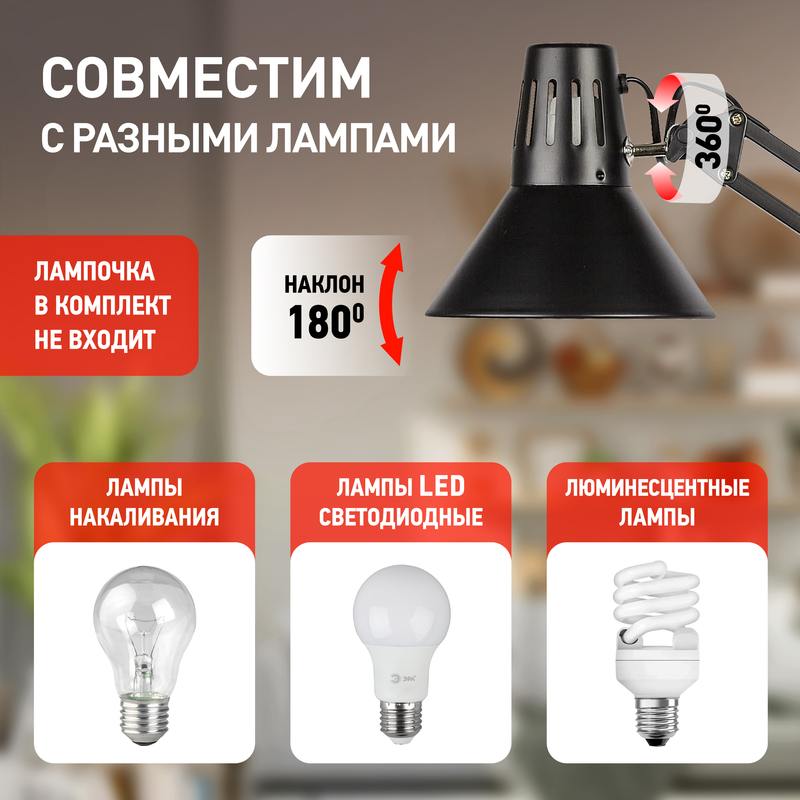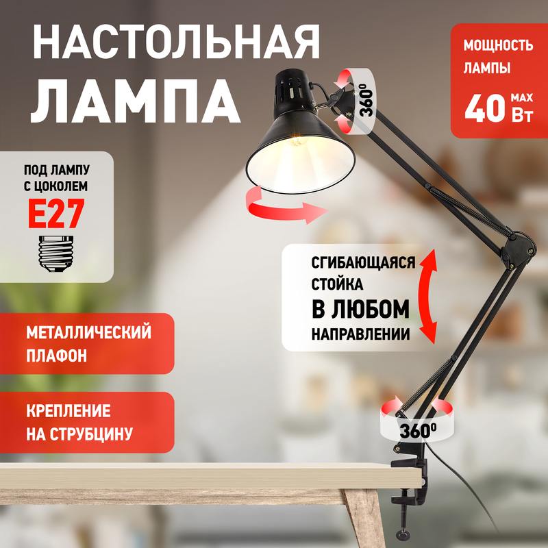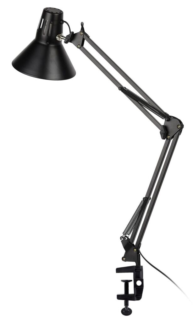 | Функциональные преимущества | Светильник может использоваться с лампой накаливания, компактной люминесцентной лампой (КЛЛ) или светодиодной (LED) лампой. Надежная пластиковая струбцина для крепления к краю поверхности. Металлические стойка и плафон. Высота плафона регулируется двухсекционной сгибающейся стойкой. Направление света регулируется поворотом и наклоном плафона в любом направлении. |