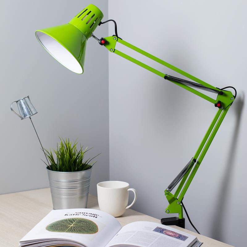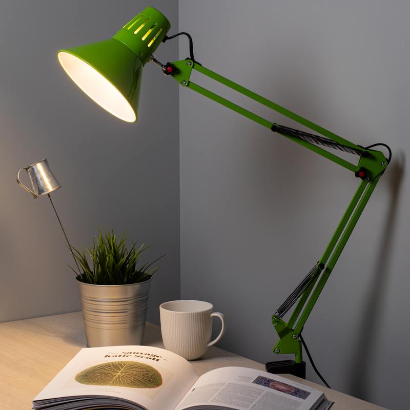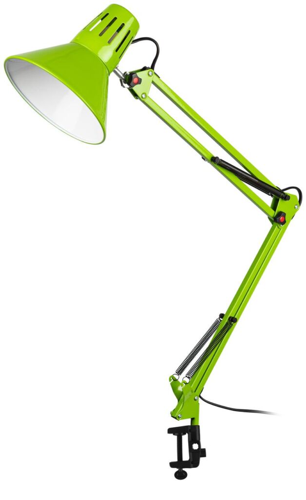| Функциональные преимущества | Светильник может использоваться с лампой накаливания, компактной люминесцентной лампой (КЛЛ) или светодиодной (LED) лампой. Надежная пластиковая струбцина для крепления к краю поверхности. Металлические стойка и плафон. Высота плафона регулируется двухсекционной сгибающейся стойкой. Направление света регулируется поворотом и наклоном плафона в любом направлении. |