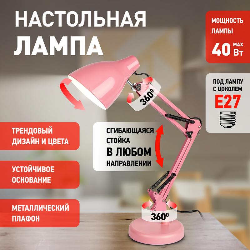 Настольный светильник ЭРА N-123-E27-40W-P трендового дизайна с классической конструкцией может использоваться с разными источниками света — лампой накаливания, компактной люминесцентной лампой (КЛЛ) или светодиодной (LED) лампой. Выключатель на проводе. Устойчивое основание. Высота плафона регулируется двухсекционной сгибающейся стойкой, направление света — поворотом и наклоном плафона в любом направлении.