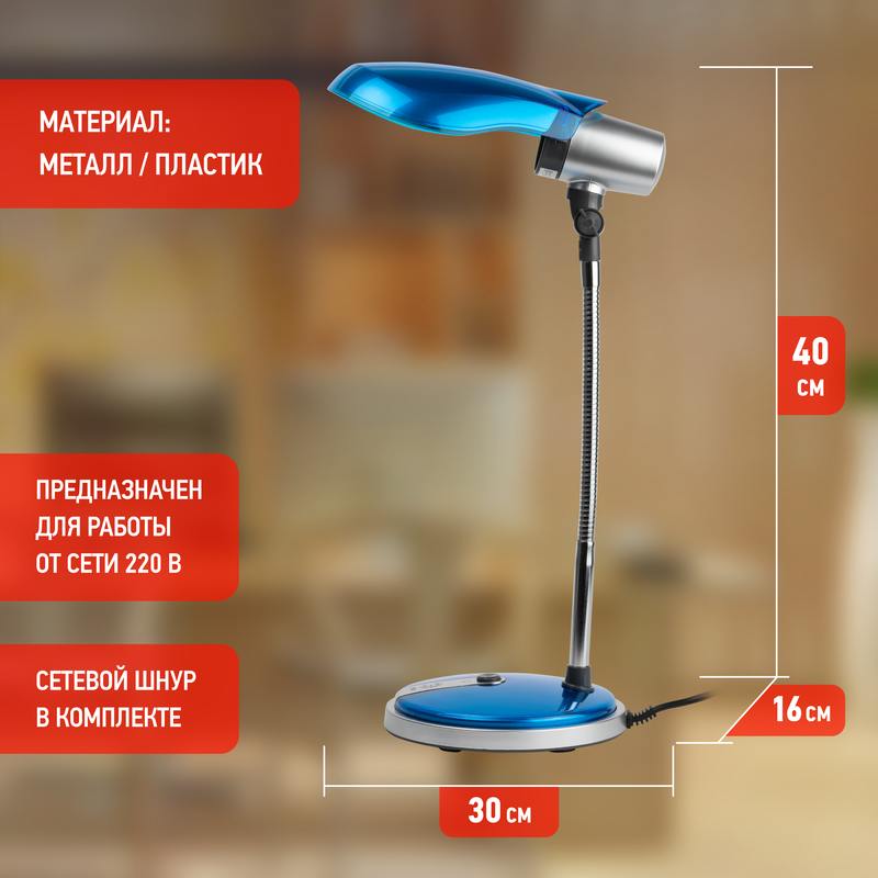 Настольный светильник ЭРА NE-301-E27-15W-BU может использоваться с компактной люминесцентной лампой (КЛЛ) или светодиодной (LED) лампой (лампу накаливания в светильнике использовать нельзя). Устойчивое металлическое основание, выключатель на основании. Направление света регулируется несколькими способами для максимального комфорта. У модели современный дизайн и яркие цвета. Привлекательный эффект полупрозрачности поверхностей плафона и основания украшают интерьер и радуют глаз. Выбирайте подходящий именно вашему дому или комнате цвет, или же создайте на столе или прикроватной тумбочке яркий позитивный акцент.