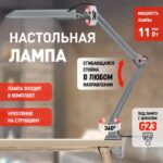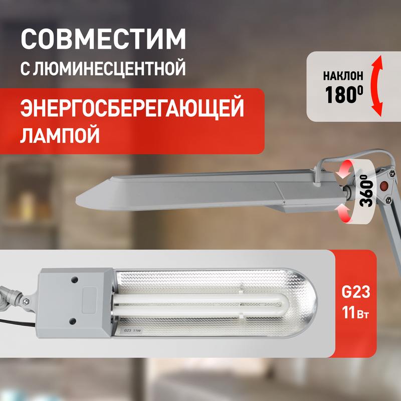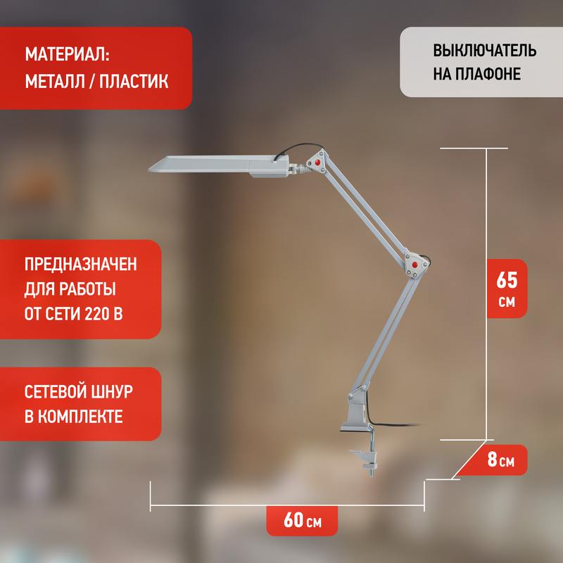 | Функциональные преимущества | Светильник предназначен для использования с энергосберегающей лампой, лампа входит к комплект. Удобное крепление на струбцину к любой плоской поверхности. Высота плафона регулируется двухсекционной сгибающейся стойкой. |