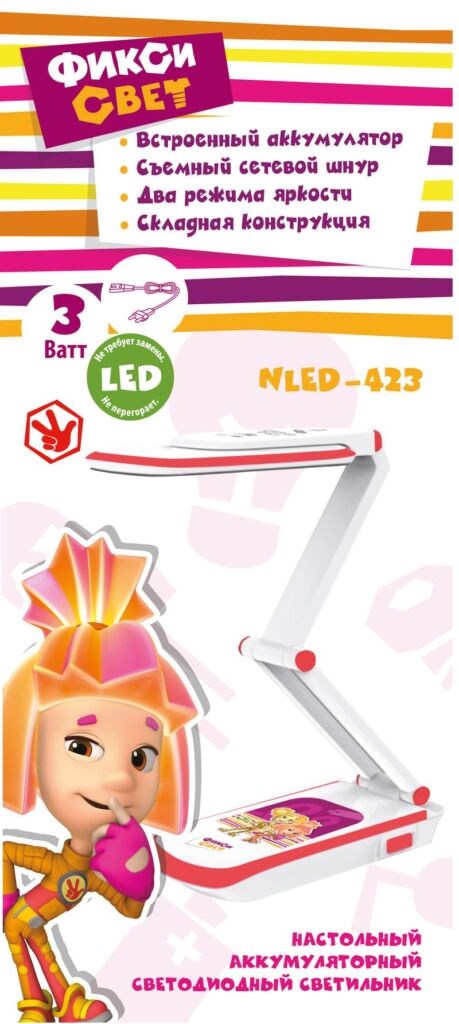 | Функциональные преимущества | Дизайн светильника и упаковка в тематике мультсериала Фиксики. Светильник со светодиодами (LED) в качестве источников света. Аккумулятор для автономной работы, два режима — максимальная яркость и приглушенный свет. Съемный сетевой шнур в комплекте. |