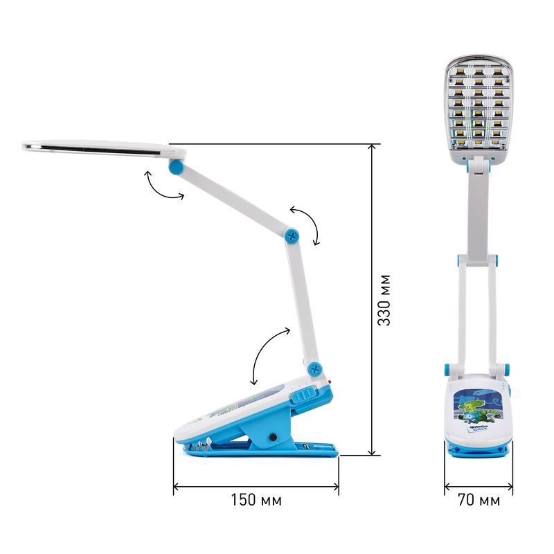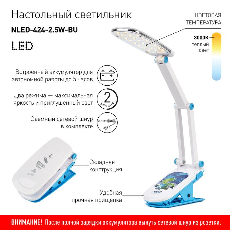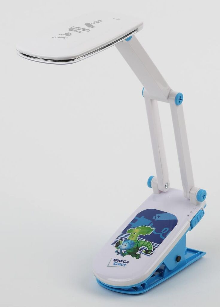 ЭРА NLED-424-2.5W-BU — светодиодный аккумуляторный настольный светильник с персонажами популярного мультфильма "Фиксики". Этот светильник-прищепку можно закрепить над столом, используя любой выступ — например, стенку полки для книг. Отлично выручает, если в доме неожиданно отключили электричество. Работает автономно до 5 часов в зависимости от режима. Часто этот светильник используют в качестве бытового фонарика. Можно выбрать максимальную яркость или приглушенный свет.