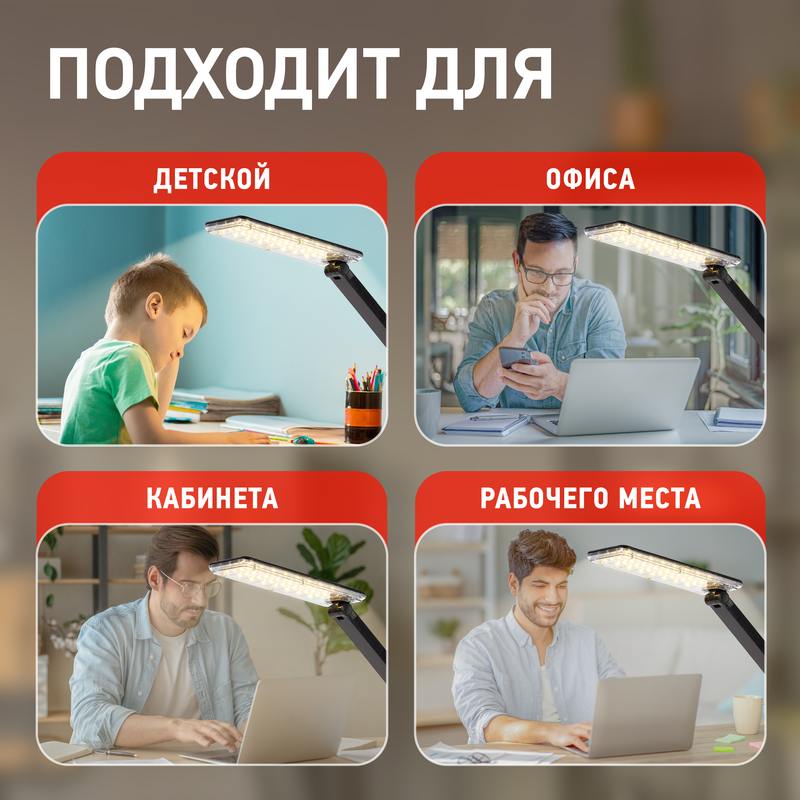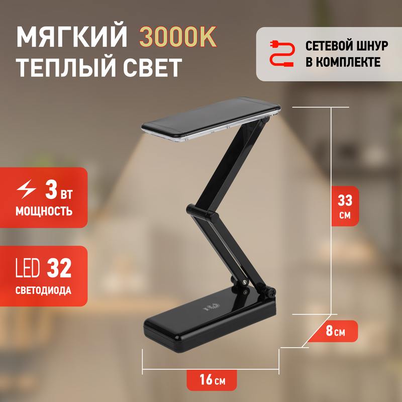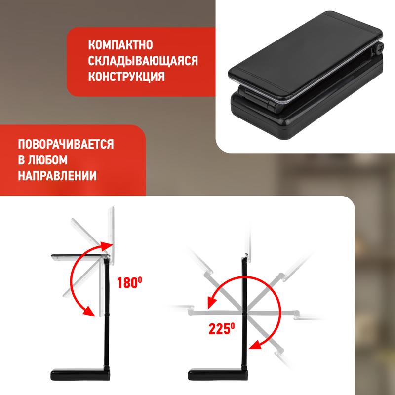 Настольный аккумуляторный светодиодный светильник ЭРА NLED-426-3W-BK может работать автономно. Просто зарядите его и используйте там, где он нужен. Не важно, есть ли поблизости розетка вам будет комфортно! Можно выбрать максимальную яркость или приглушенный свет. Часто этот светильник используют в качестве бытового фонарика. У светильника съемный сетевой шнур в комплекте и складная конструкция для легкости его перевозки и компактного хранения.