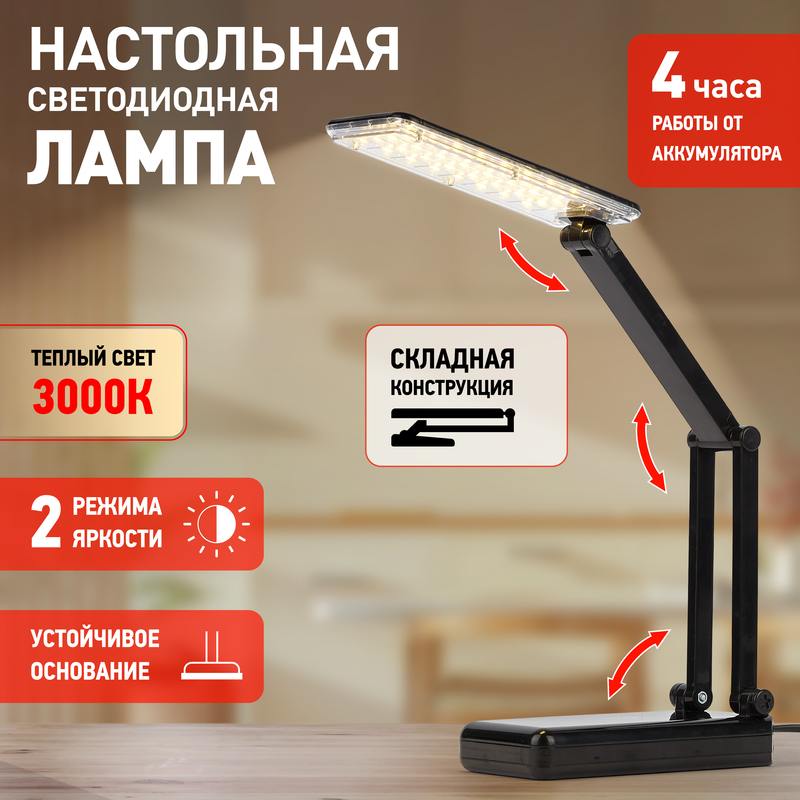 | Функциональные преимущества | Светильник со светодиодами (LED) в качестве источников света. Аккумулятор для автономной работы. Два режима — максимальная яркость и приглушенный свет. Съемный сетевой шнур в комплекте. Устойчивое основание. Складная конструкция. Теплый свет, аналогичный свету лампы накаливания. |