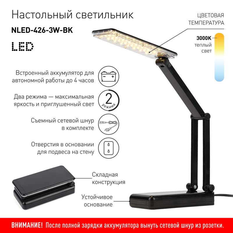 Характеристики Настольный светильник ЭРА NLED-426-3W-BK светодиодный аккумуляторный черный: