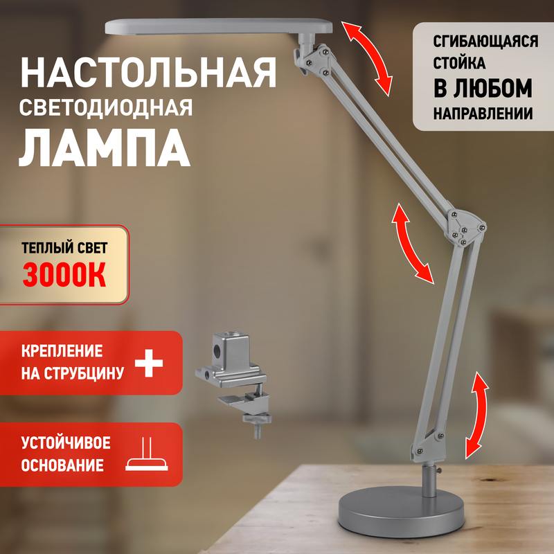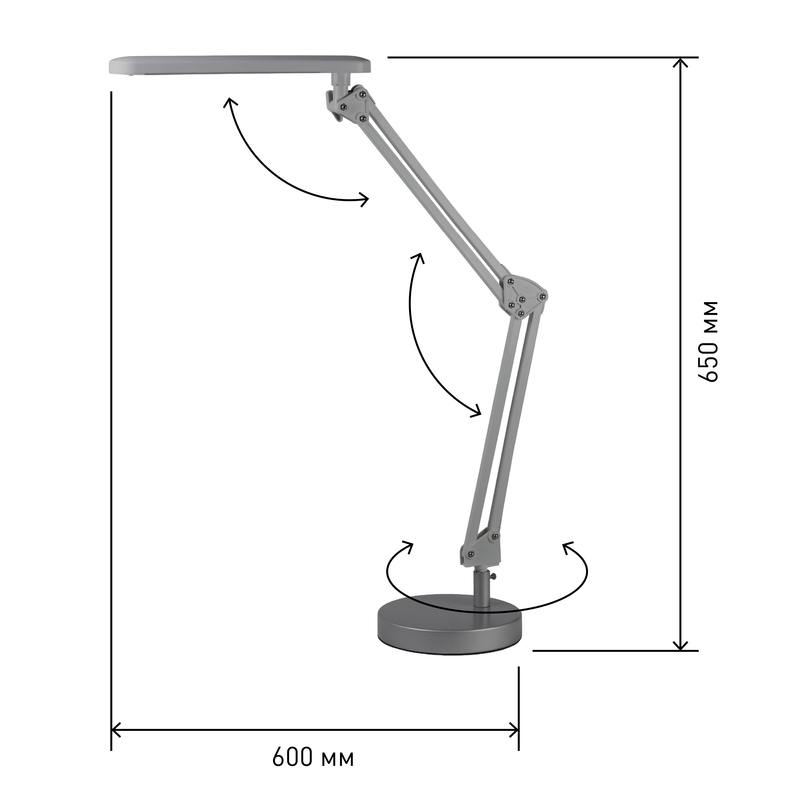 | Функциональные преимущества | Светильник со светодиодами (LED) в качестве источников света. Два варианта крепления в комплекте: основание, струбцина. Высота плафона регулируется двухсекционной сгибающейся стойкой, направление света регулируется поворотом плафона в любом направлени. |