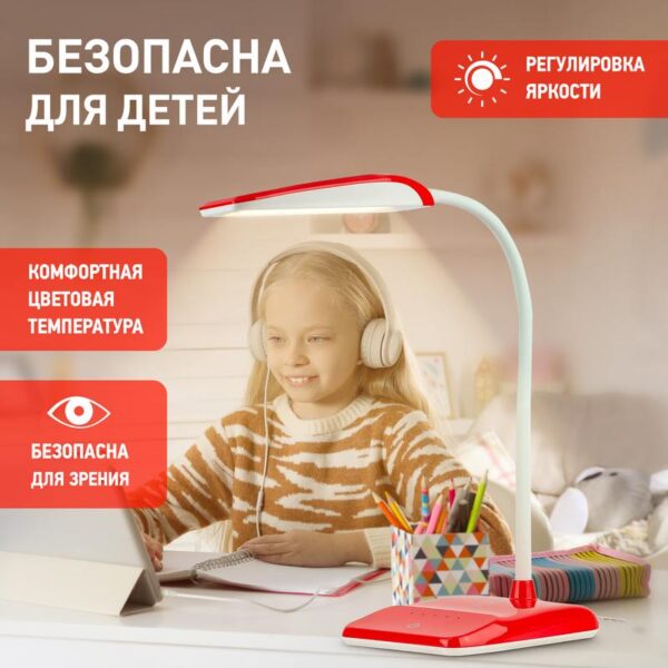 Настольный светильник ЭРА NLED-447-9W-R со светодиодами (LED) в качестве источников света. Светильник оснащен сенсорным управлением с возможностью регулировки яркости освещения, 4 уровня. Гибкая стойка позволяет настраивать комфортную высоту плафона и направлять свет под любым углом. Современный дизайн в стиле хай-тек.