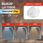 | Функциональные преимущества | Светильник со светодиодами (LED) в качестве источников света. Выбор цветовой температуры — 3 цвета: 3000К, 4500К, 6000К. Сенсорное переключение. Пятиступенчатый диммер для регулировки яркости. Гибкая стойка — наклон и поворот плафона в любом направлении. |