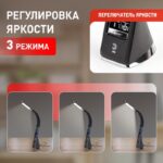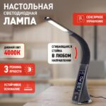 Настольный светильник ЭРА NLED-461-7W-BK со светодиодами (LED) в качестве источников света в дизайне "под кожу". Оснащен сенсорным управлением, есть регулировки яркости освещения — 3 уровня. Главное преимущество светильника — ЖК дисплей с функциями часов, будильника, календаря и термометра. Сенсорная кнопка с обратной стороны стойки обеспечивает опцию выбора яркости дисплея с возможностью его выключения. Высота плафона регулируется гибкой стойкой, направление света регулируется поворотом плафона в любом направлении.