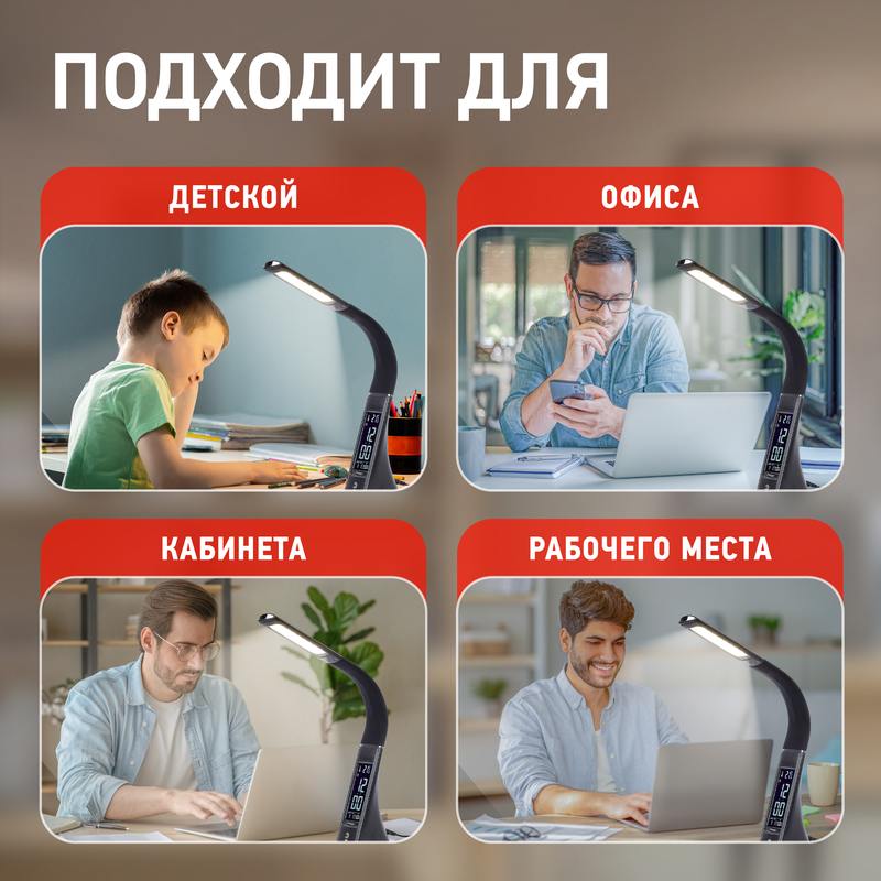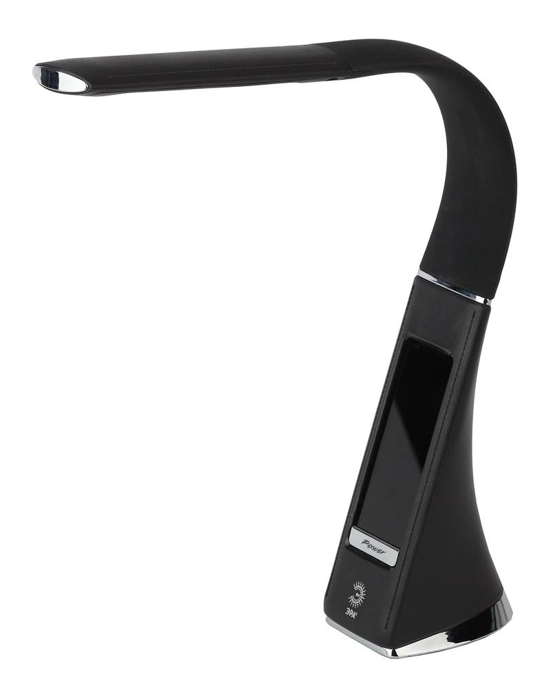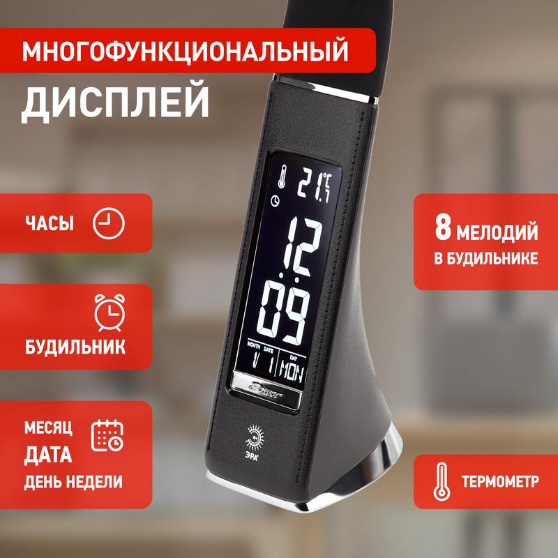 Настольный светильник ЭРА NLED-461-7W-BK со светодиодами (LED) в качестве источников света в дизайне "под кожу". Оснащен сенсорным управлением, есть регулировки яркости освещения — 3 уровня. Главное преимущество светильника — ЖК дисплей с функциями часов, будильника, календаря и термометра. Сенсорная кнопка с обратной стороны стойки обеспечивает опцию выбора яркости дисплея с возможностью его выключения. Высота плафона регулируется гибкой стойкой, направление света регулируется поворотом плафона в любом направлении.