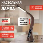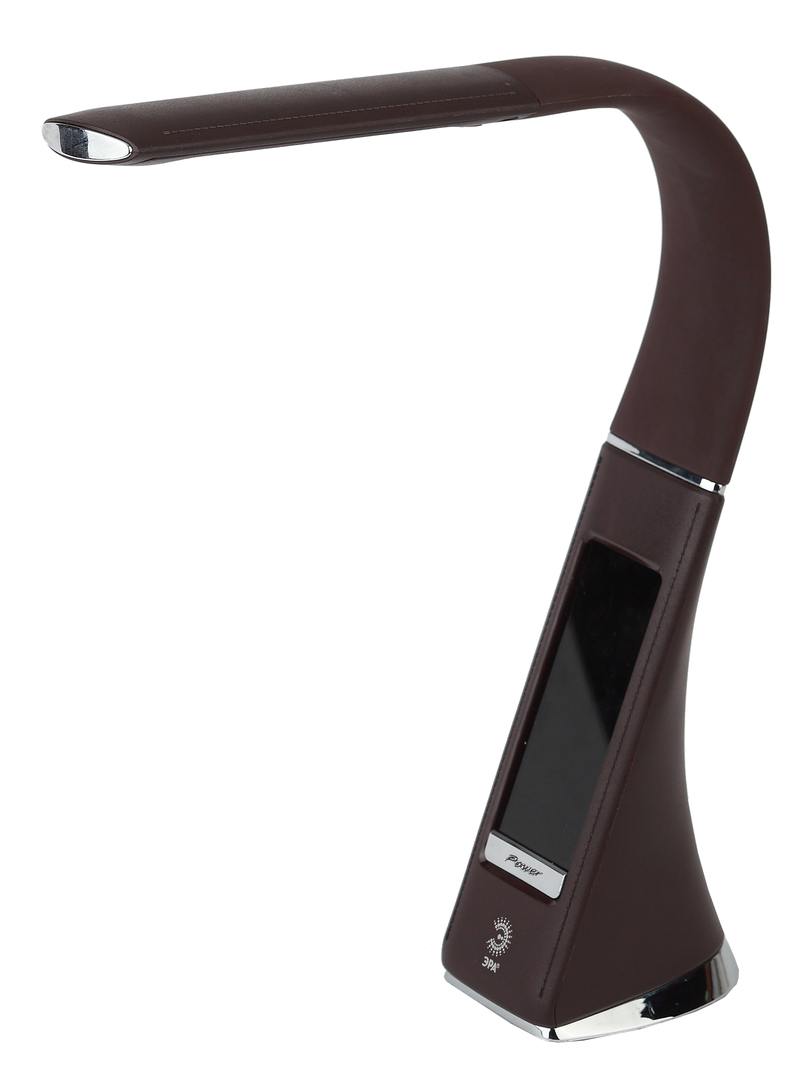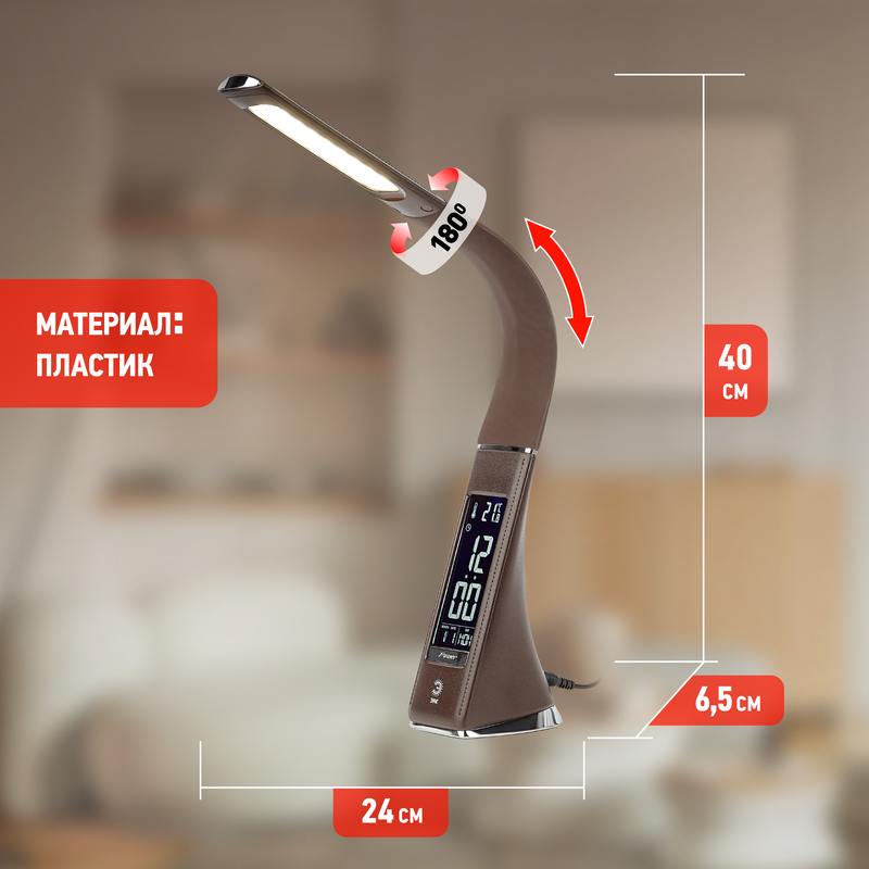 Настольный светильник ЭРА NLED-461-7W-BR со светодиодами (LED) в качестве источников света в дизайне "под кожу". Оснащен сенсорным управлением, есть регулировки яркости освещения — 3 уровня. Главное преимущество светильника — ЖК дисплей с функциями часов, будильника, календаря и термометра. Сенсорная кнопка с обратной стороны стойки обеспечивает опцию выбора яркости дисплея с возможностью его выключения. Высота плафона регулируется гибкой стойкой, направление света регулируется поворотом плафона в любом направлении.