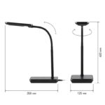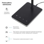 | Функциональные преимущества | Светильник со светодиодами (LED) в качестве источников света. Выбор цветовой температуры — 3 цвета: 3000К, 4500К, 6000К. Сенсорное переключение. Пятиступенчатый диммер для регулировки яркости. Устойчивое плоское основание. Направление света регулируется несколькими способами для максимального комфорта: гибкая стойка; поворот плафона относительно стойки для удобного направления света. |