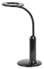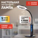 Настольный светильник ЭРА NLED-476-10W-BK со светодиодами (LED) в качестве источников света. У светильника сенсорное управление, плавный или ступенчатый (на выбор) диммер для регулировки яркости. 5 режимов цветовой температуры света: мягкий теплый свет, теплый свет, белый свет, дневной свет, холодный свет. Главное преимущество светильника — ЖК дисплей с функциями часов, будильника, календаря и термометра. Светильник сохраняет выбранные настройки света при включении-выключении. Высота плафона регулируется гибкой стойкой, направление света — поворотом плафона в любом направлении. Плафон кольцевой формы оптимально распределяет свет, это очень удобно и отлично подходит для мелкой ручной работы.