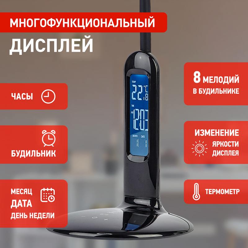Настольный светильник ЭРА NLED-476-10W-BK со светодиодами (LED) в качестве источников света. У светильника сенсорное управление, плавный или ступенчатый (на выбор) диммер для регулировки яркости. 5 режимов цветовой температуры света: мягкий теплый свет, теплый свет, белый свет, дневной свет, холодный свет. Главное преимущество светильника — ЖК дисплей с функциями часов, будильника, календаря и термометра. Светильник сохраняет выбранные настройки света при включении-выключении. Высота плафона регулируется гибкой стойкой, направление света — поворотом плафона в любом направлении. Плафон кольцевой формы оптимально распределяет свет, это очень удобно и отлично подходит для мелкой ручной работы.