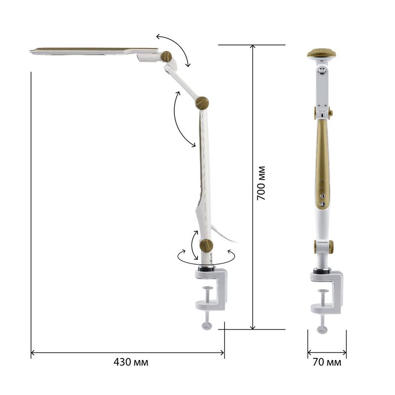 | Функциональные преимущества | Светильник со светодиодами (LED) в качестве источников света. Выбор цветовой температуры — 3 цвета: 3000К, 4500К, 6000К. Сенсорное переключение. Плавный диммер для регулировки яркости. Светильник сохраняет выбранные настройки при включении-выключении. Высота плафона регулируется двухсекционной сгибающейся стойкой, направление света регулируется поворотом и наклоном плафона в любую сторону. Модель на струбцине. |