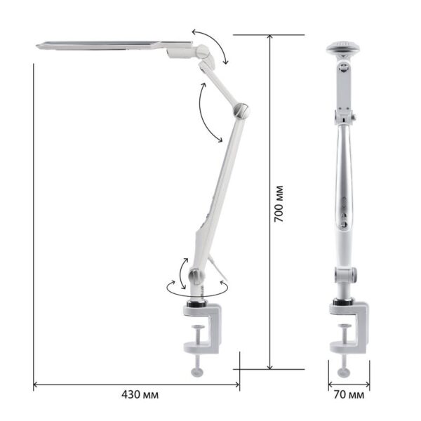 | Функциональные преимущества | Светильник со светодиодами (LED) в качестве источников света. Выбор цветовой температуры — 3 цвета: 3000К, 4500К, 6000К. Сенсорное переключение. Плавный диммер для регулировки яркости. Светильник сохраняет выбранные настройки при включении-выключении. Высота плафона регулируется двухсекционной сгибающейся стойкой, направление света регулируется поворотом и наклоном плафона в любую сторону. Модель на струбцине. |
