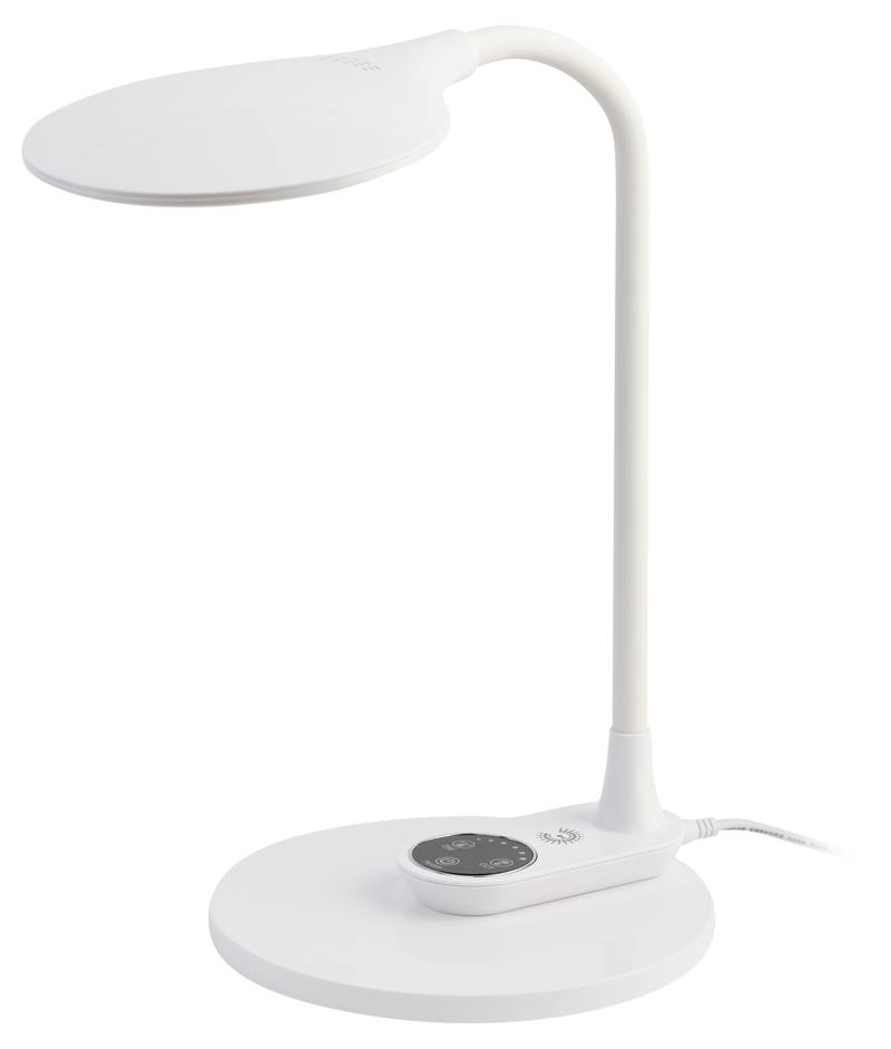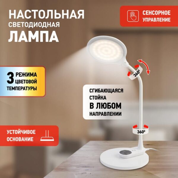 Настольный светильник ЭРА NLED-498-10W-W со светодиодами (LED) в качестве источников света. Оснащен сенсорным управлением с возможностью выбора цветовой температуры (теплый, нейтральный или холодный свет). Плавный диммер для регулировки яркости. Светильник сохраняет выбранные настройки при включении-выключении. Направление света регулируется наклоном и поворотом плафона в любом направлении. Форма плафона в виде круга обеспечивает оптимальное рассеивание света и очень удобна при мелкой ручной работе. Светильник имеет съемное основание и возможность подвеса на стену. По вашему выбору можно использовать светильник как настольный с устойчивым основанием или как съемное бра.
