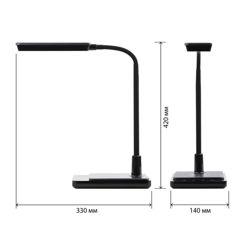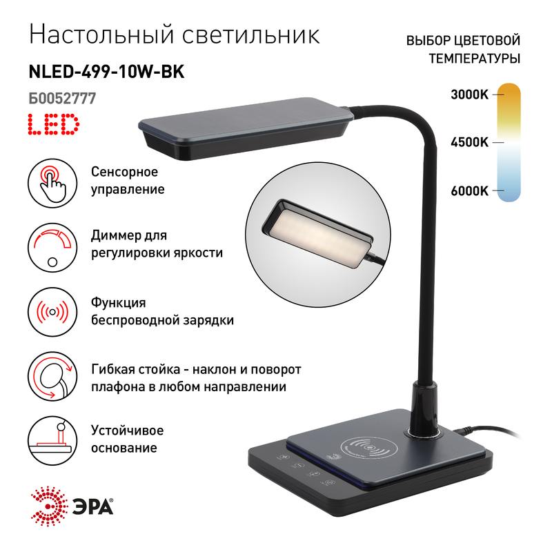 Настольный светильник ЭРА NLED-499-10W-BK со светодиодами (LED) в качестве источников света. Оснащен сенсорным управлением с возможностью выбора цветовой температуры (теплый, нейтральный или холодный свет). Плавный диммер для регулировки яркости. Светильник сохраняет выбранные настройки при включении-выключении. Направление света регулируется наклоном и поворотом плафона в любом направлении. Светильник имеет встроенный модуль Qi для беспроводной зарядки мобильных устройств. Просто положите телефон, поддерживающий функцию Qi, на основание светильника в отмеченной зоне — светильник подзарядит его удобно и быстро!