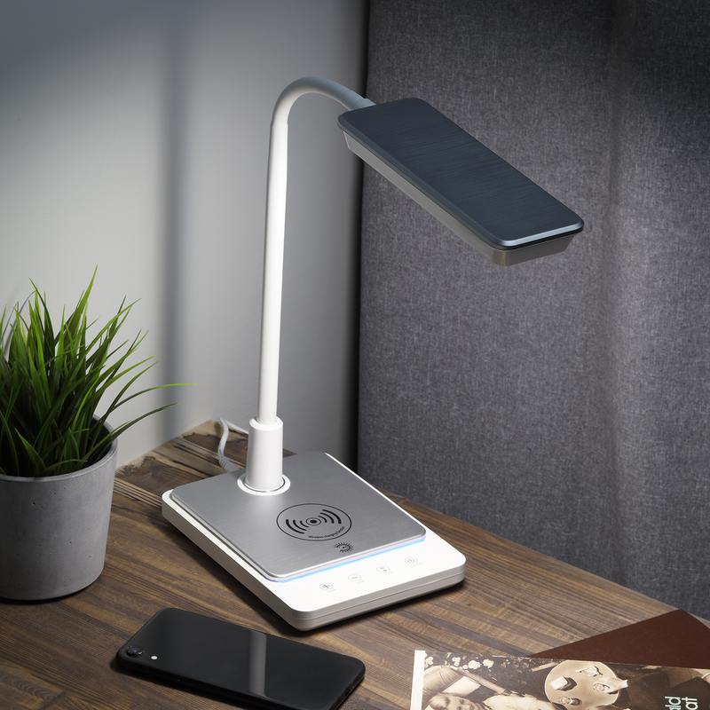 | Функциональные преимущества | Светильник со светодиодами (LED) в качестве источников света. Выбор цветовой температуры — 3 цвета: 3000К, 4500К, 6000К. Сенсорное переключение. Плавный диммер для регулировки яркости. Светильник сохраняет выбранные настройки при включении-выключении. Встроенный блок для беспроводной зарядки устройств. Наклон и поворот плафона в любом направлении. |