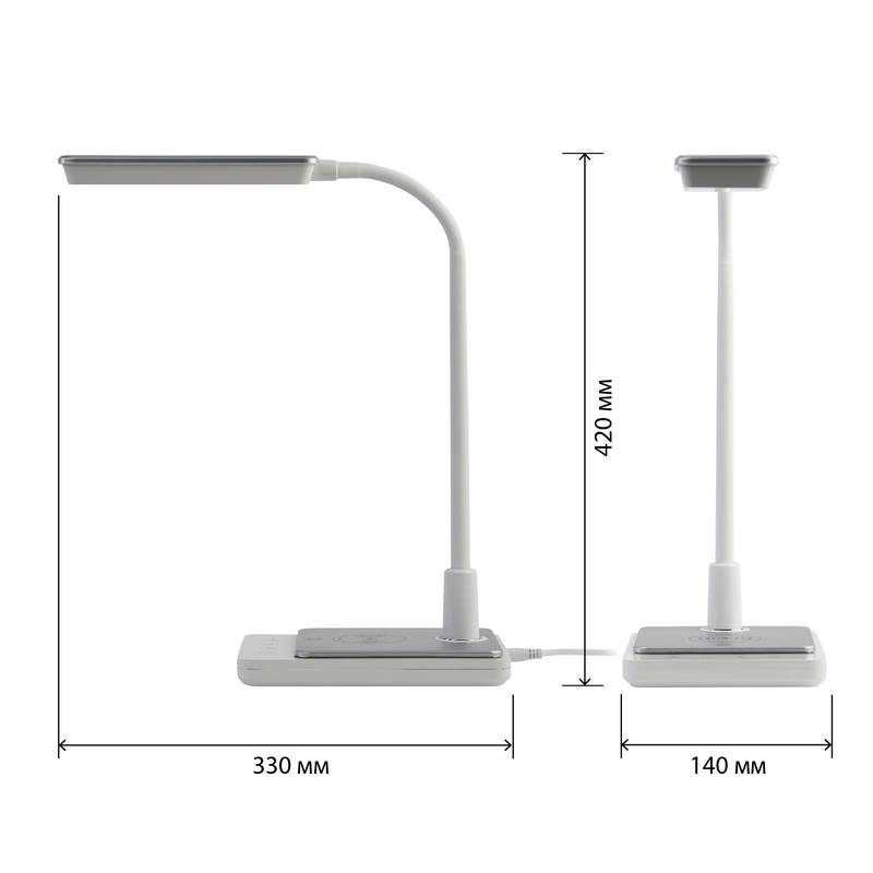 Настольный светильник ЭРА NLED-499-10W-W со светодиодами (LED) в качестве источников света. Оснащен сенсорным управлением с возможностью выбора цветовой температуры (теплый, нейтральный или холодный свет). Плавный диммер для регулировки яркости. Светильник сохраняет выбранные настройки при включении-выключении. Направление света регулируется наклоном и поворотом плафона в любом направлении. Светильник имеет встроенный модуль Qi для беспроводной зарядки мобильных устройств. Просто положите телефон, поддерживающий функцию Qi, на основание светильника в отмеченной зоне — светильник подзарядит его удобно и быстро!