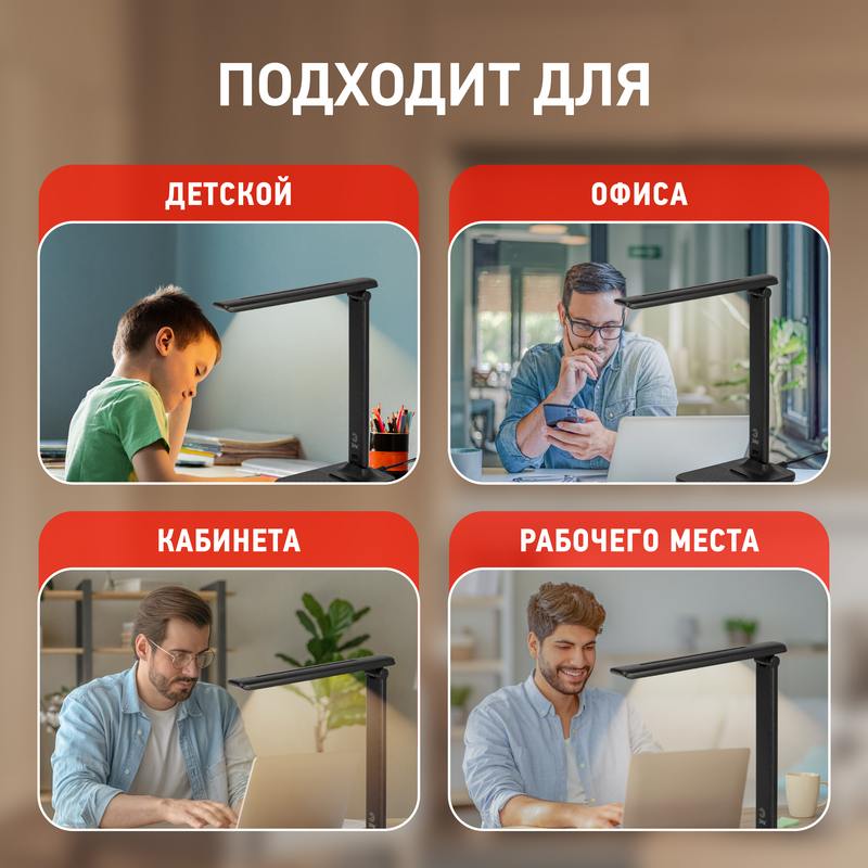 Настольный светильник ЭРА NLED-500-10W-BK со светодиодами (LED) в качестве источников света в дизайне "под кожу". Удобная складная модель с сенсорным управлением, возможностью выбора цветовой температуры и плавным диммером для регулировки яркости.