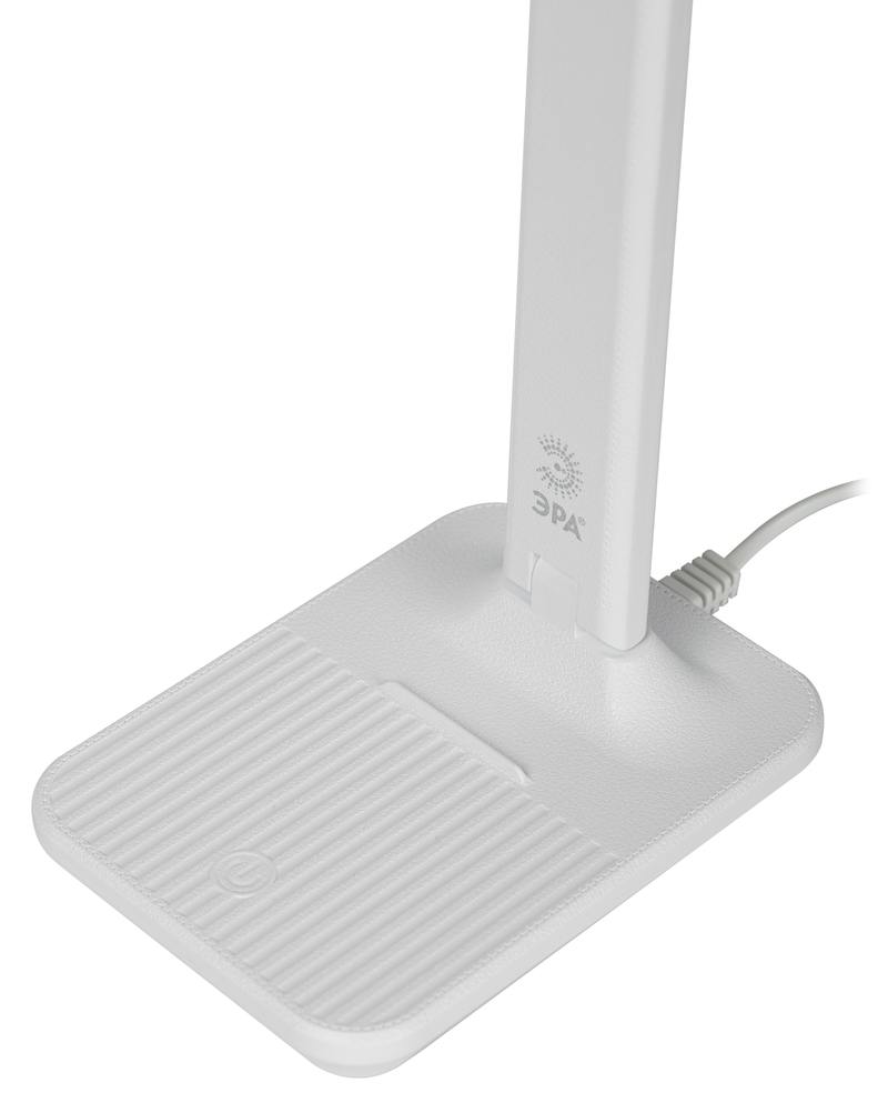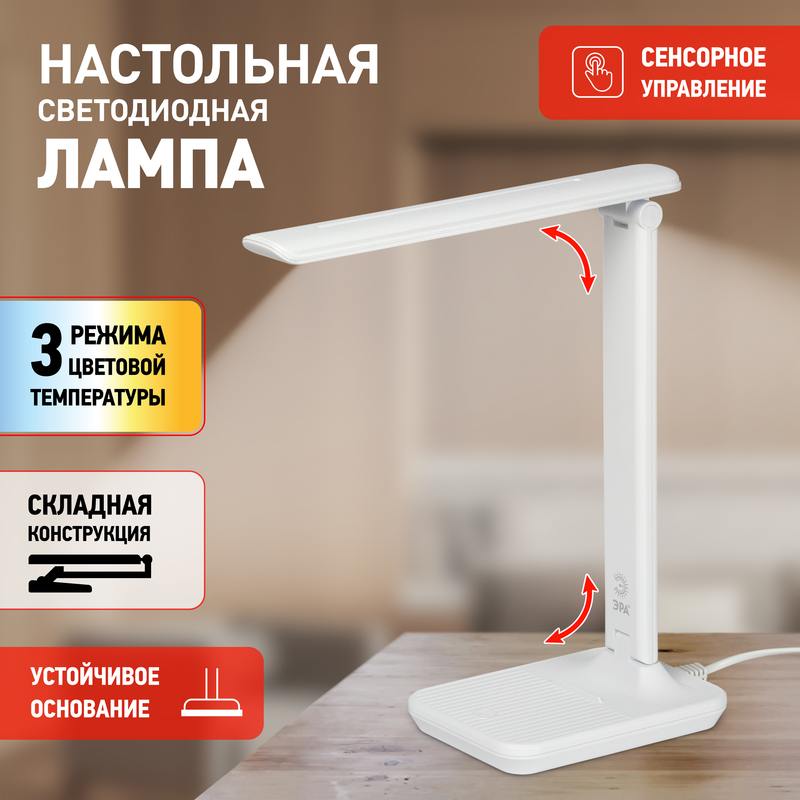 Настольный светильник ЭРА NLED-500-10W-W со светодиодами (LED) в качестве источников света в дизайне "под кожу". Удобная складная модель с сенсорным управлением, возможностью выбора цветовой температуры и плавным диммером для регулировки яркости.