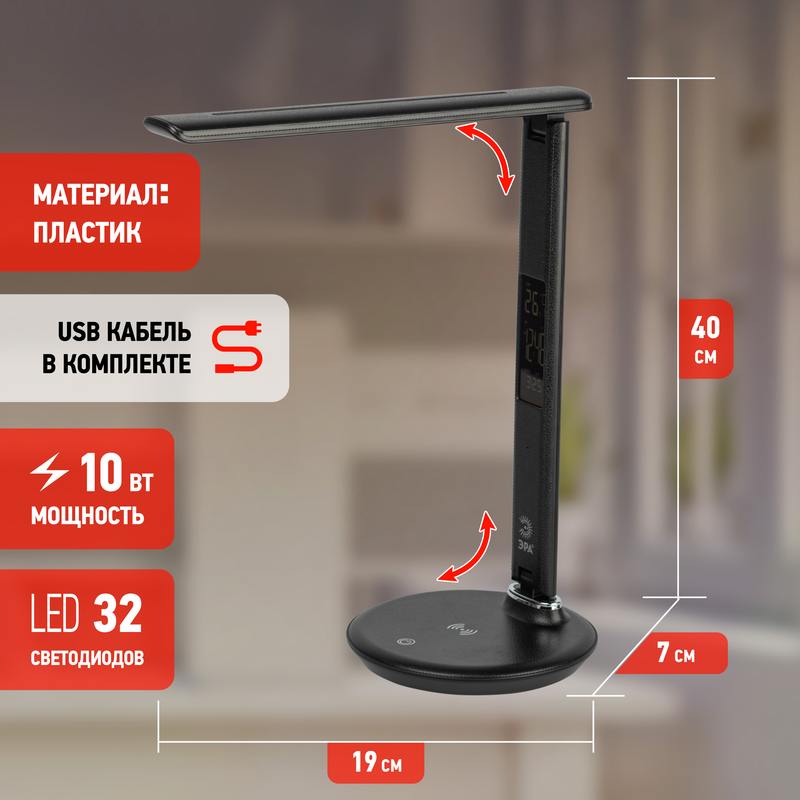 Настольный светильник ЭРА NLED-505-10W-BK со светодиодами (LED) в качестве источников света в дзайне "под кожу". Удобная складная конструкция с сенсорным управлением, возможностью выбора цветовой температуры и плавным диммером для регулировки яркости. На основании светильника расположен встроенный модуль Qi для беспроводной зарядки мобильных устройств. Просто положите телефон, поддерживающий функцию Qi на основание светильника в отмеченной зоне — светильник подзарядит его. Главное преимущество светильника — многофункциональный дисплей с функциями часов, будильника, календаря и термометра.