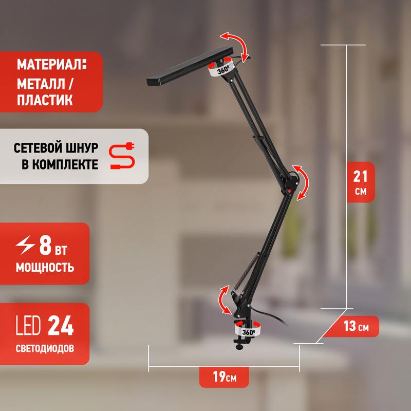 Характеристики Настольный светильник ЭРА NLED-507-8W-BK светодиодный на струбцине чёрный: