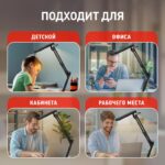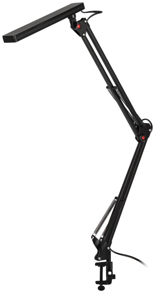 | Функциональные преимущества | Настольный светильник со светодиодами (LED) в качестве источников света. Светильник имеет возможность выбора цветовой температуры (теплый, нейтральный или холодный свет), которая регулируется выключателем на проводе. Высота плафона регулируется двухсекционной сгибающейся стойкой. Удобное крепление на струбцину к любой плоской поверхности. |