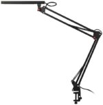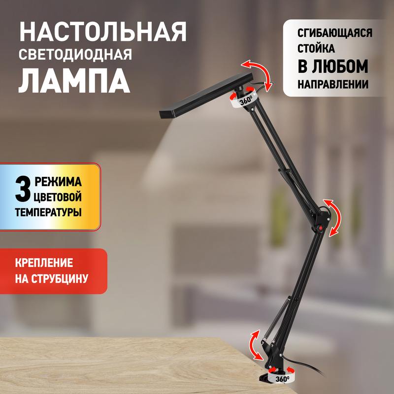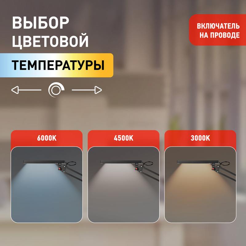 Светильник со светодиодами (LED) в качестве источников света. Модель на струбцине. Выключатель на проводе. Изменяемая цветовая температура: 3000К/4500К/6000К. Высота плафона регулируется двухсекционной сгибающейся стойкой, направление света регулируется поворотом плафона в любом направлении.