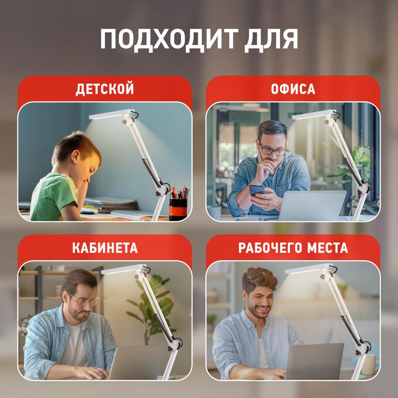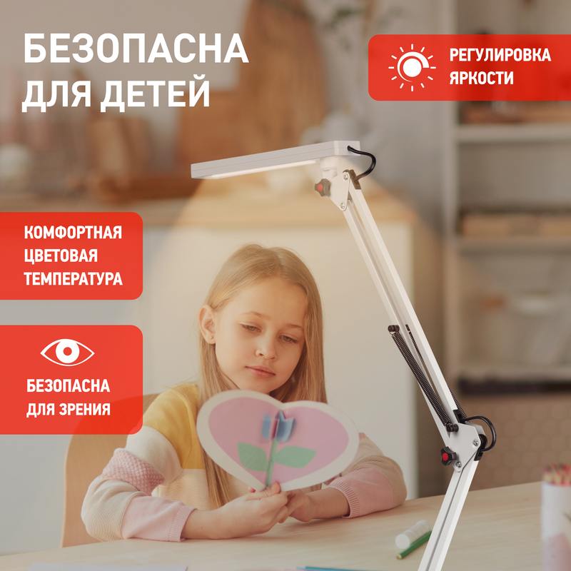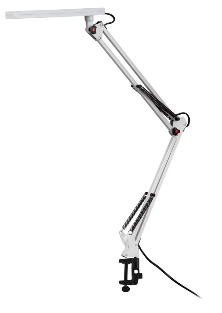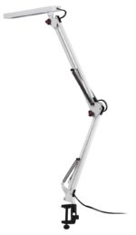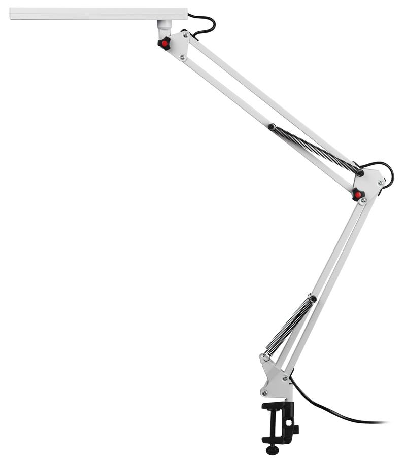 | Функциональные преимущества | Настольный светильник со светодиодами (LED) в качестве источников света. Светильник имеет возможность выбора цветовой температуры (теплый, нейтральный или холодный свет), которая регулируется выключателем на проводе. Высота плафона регулируется двухсекционной сгибающейся стойкой. Удобное крепление на струбцину к любой плоской поверхности. |