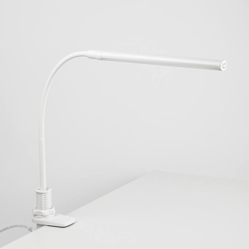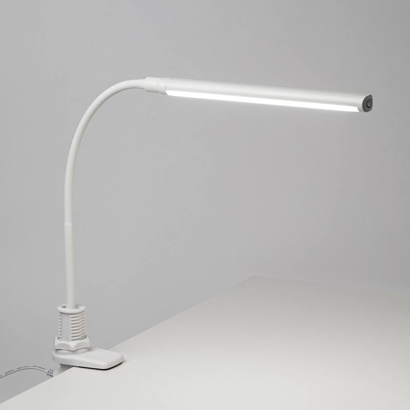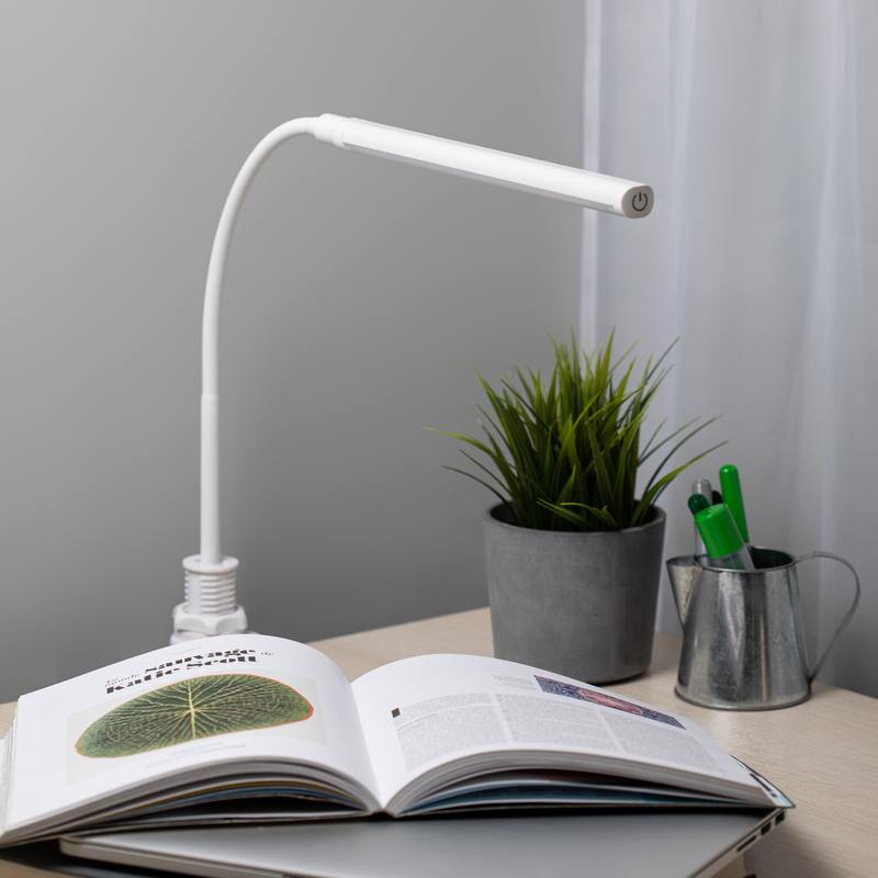 Настольный светильник со светодиодами (LED) в качестве источников света, 8 Вт. Модель на струбцине с сенсорным переключателем на плафоне. Плавная регулировки яркости. Высота плафона регулируется гибкой стойкой. Нейтральный белый свет — цветовая температура 4000К.