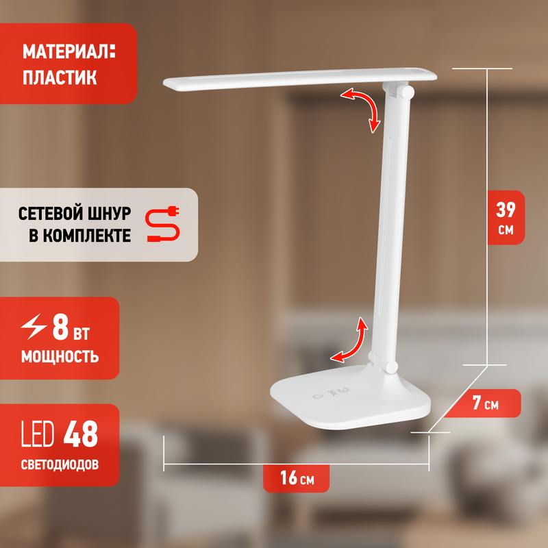 | Функциональные преимущества | Настольный светильник со светодиодами (LED) в качестве источников света. Складная модель. Встроенный литиевый аккумулятор. Подзарядка от USB. USB кабель в комплекте. Сенсорное управление. Плавный диммер. |