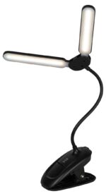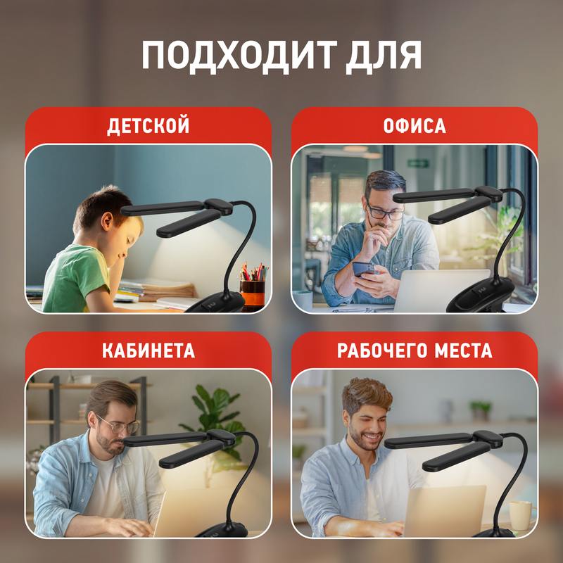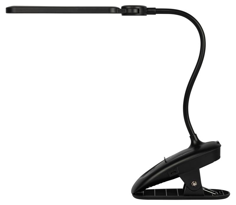 | Функциональные преимущества | Настольный светильник с двойным плафоном со светодиодами (LED) в качестве источников света. Встроенный литиевый аккумулятор, подзарядка от USB. Изменяемая цветовая температура. На прищепке. USB кабель в комплекте. Сенсорное управление. Плавный диммер. Гибкая стойка. |