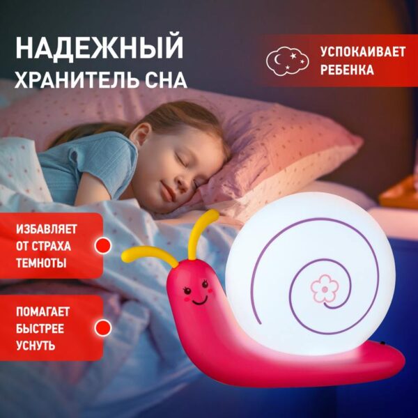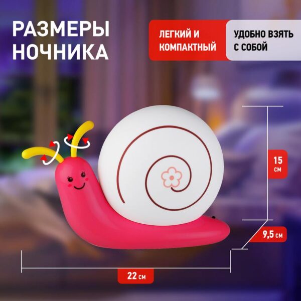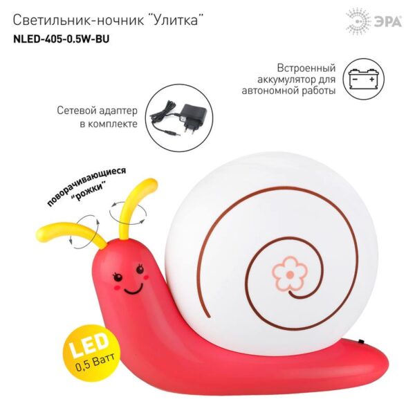 Очаровательный светодиодный ночник для детей ЭРА NLED-405-0.5W-M в виде улитки с мягкими поворачивающимися "рожками", с выключателем на корпусе. Этот светильник поможет уснуть малышу, создаст уютную атмосферу во время отдыха семьи, а также легко впишется в декор детской комнаты. Светодиодный ночник для новорожденных работает от аккумулятора, а потому не зависит от проводов: подзарядите его с помощью входящего в комплект сетевого адаптера и свободно переносите из спальни в детскую комнату и наоборот. Добрый подарок и для самых маленьких, и для непосед постарше, и даже для взрослых — эта милая вещь вряд ли кого-то оставит равнодушным! Функциональные преимущества: со светодиодами (LED) в качестве источников света, встроенный аккумулятор для автономной работы, сетевой адаптер в комплекте, детский дизайн в виде улитки с поворачивающимися "рожками".