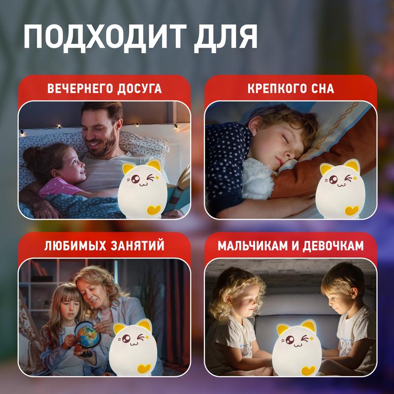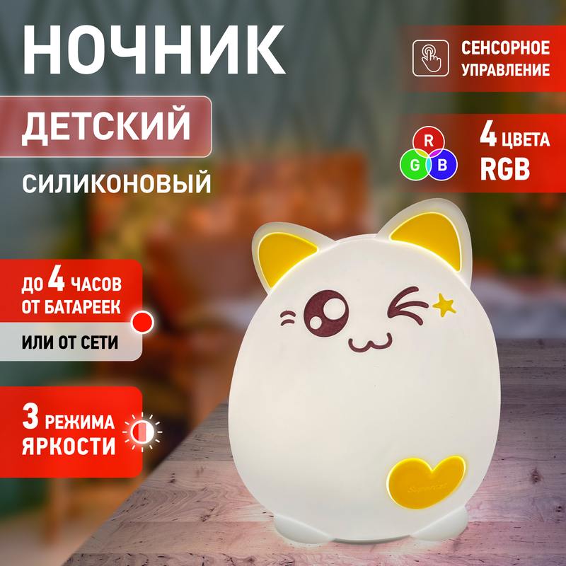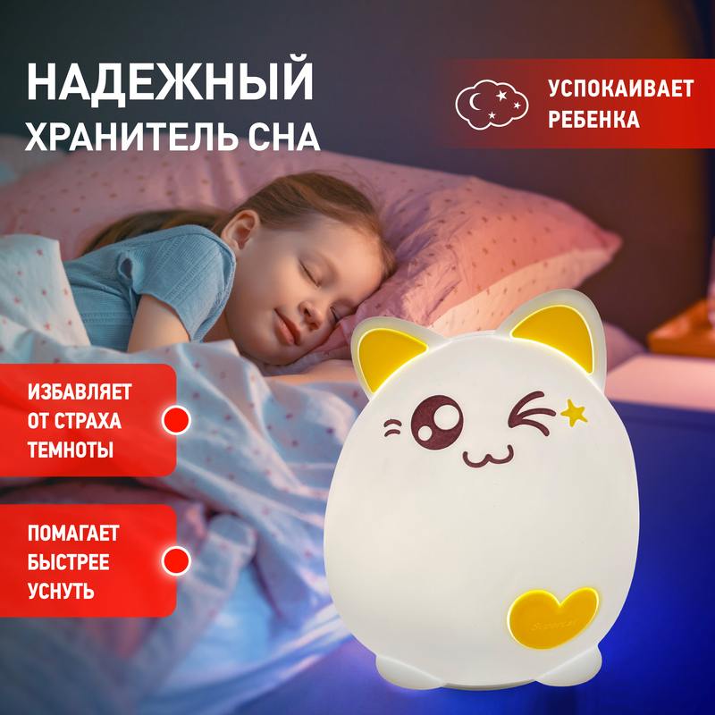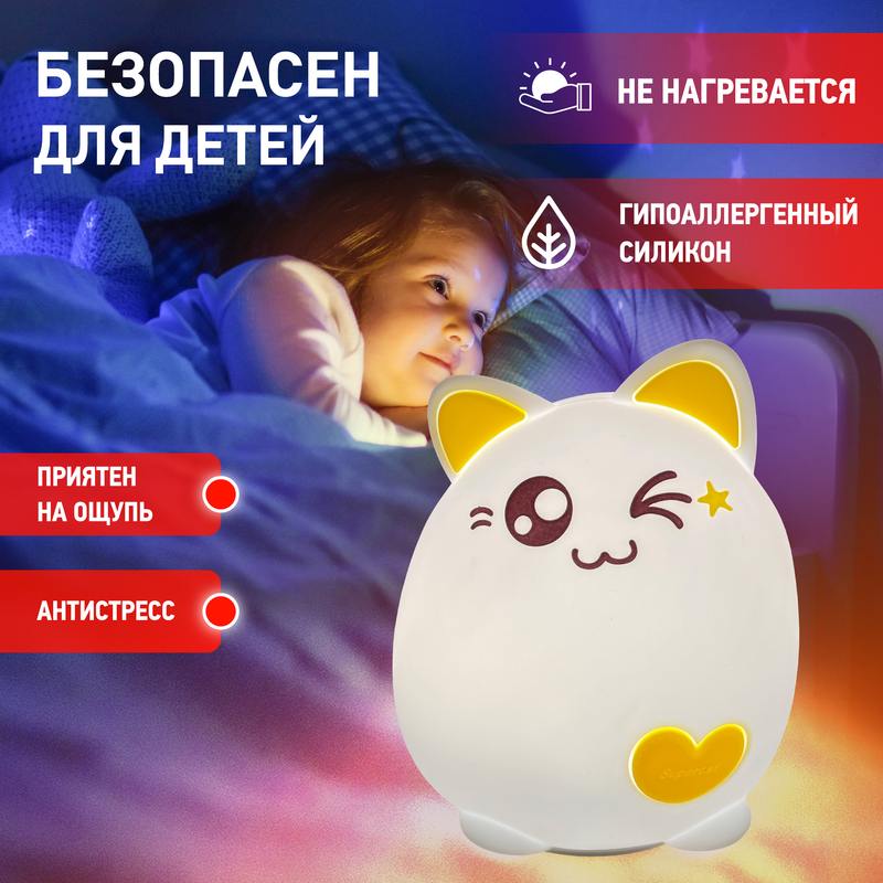 Мягкий детский ночник ЭРА NLED-413-1W-Y в виде милого котика с желтыми ушками. Такая вещь поможет красиво оформить интерьер, успокоить ребенка перед сном и создать уютную атмосферу в квартире. У светодиодного светильника 3 режима: приглушенный свет, максимальная яркость и медленная смена цветов. Один для спокойной ночи без кошмаров, другой для подготовки к отдыху, а третий для привлечения внимания малыша после чтения или вечерних игр. Свечение регулируется простым касанием или постукиванием а делать это вдвойне приятно благодаря мягкому силикону. Светодиодный ночник работает на батарейках (не входят в комплект), а потому его легко брать с собой в спальню или детскую комнату. Кроме того, Ваш ребенок может мягко мять Котика при включении: он послужит хорошей антистресс-игрушкой. Такой подарок будет идеальным и для малыша, и для взрослого!