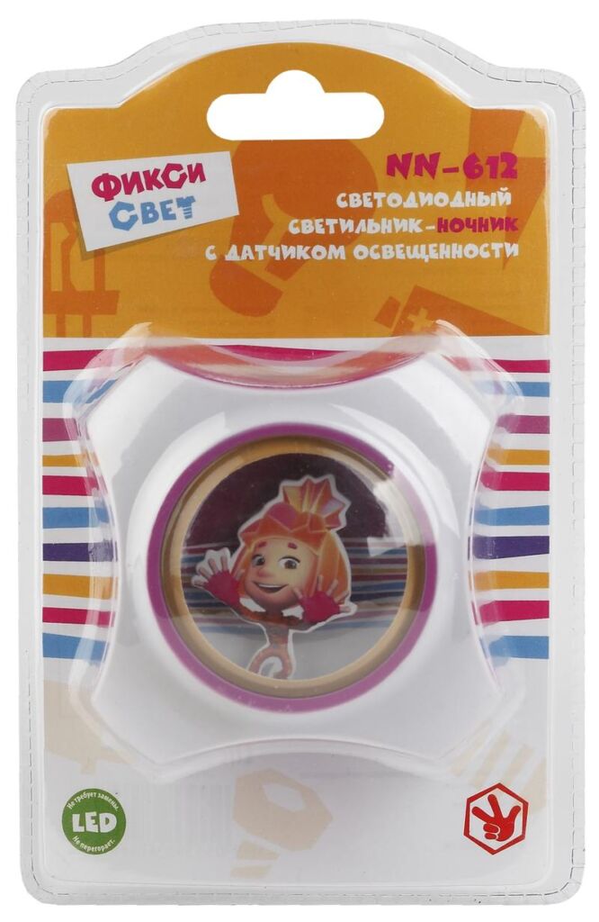 Светодиодный ночник с сенсором света. Часть лицензированной серии "Фиксики". За прозрачным "экраном" ночника — любимые детьми и взрослыми герои популярного современного мультфильма. Максимально удобное устройство! Этот ночник включается автоматически, как только в помещении становится темно. И выключается, когда наступает утро или в комнате включают основное освещение. Просто воткните компактный ЭРА NN-612-LS-PL в розетку — все остальное он будет ответственно выполнять сам!