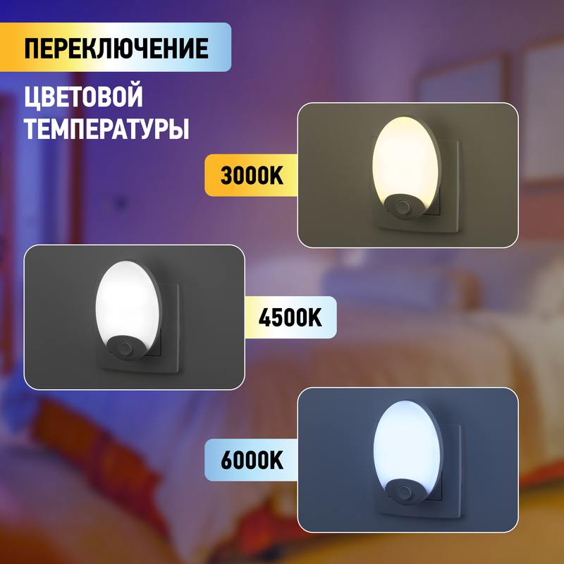 Светильник-ночник со светодиодами (LED) в качестве источников света. С выключателем и возможностью выбора цветовой температуры (теплый, нейтральный или холодный свет). Светодиодный ночник не мерцает, что помогает сохранить здоровье глаз. Минимальное потребление энергии позволяет использовать прибор всю ночь.