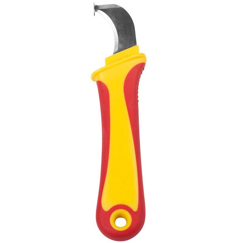 Нож монтажника предназначен для удаления изоляции с многожильного кабеля и прочих работ. Наличие пластины на кончике лезвия обеспечивает наиболее безопасное снятие оболочки с многожильных кабелей без повреждения жильной изоляции. Инструмент обеспечивает высокое качество и надежность снятия оболочки без риска повреждения жильной изоляции. Удобная противоскользящая рукоятка обеспечивает комфорт и повышенную безопасность в работе.