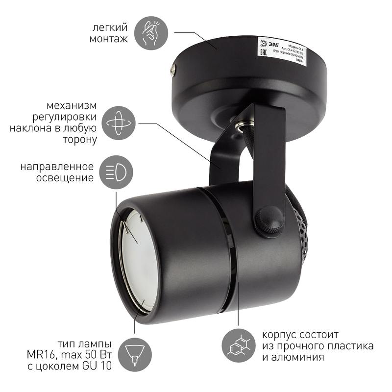 Характеристики OL4 GU10 BK Подсветка ЭРА Накладной, черный: