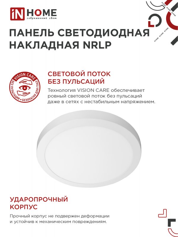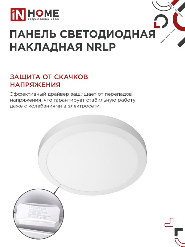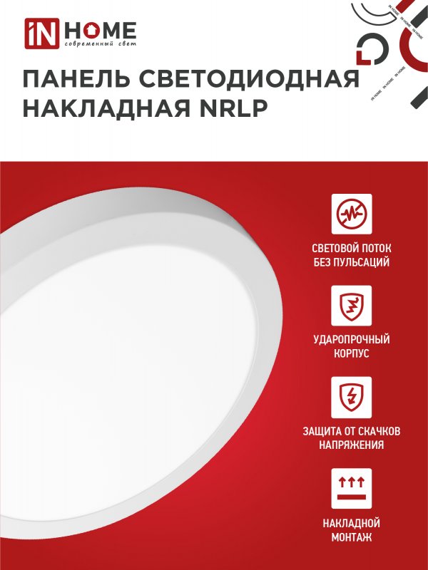 Назначение и применение Панель светодиодная накладная круглая NRLP 24Вт 230В 4000К 1680Лм 285мм белая IP40 IN HOME