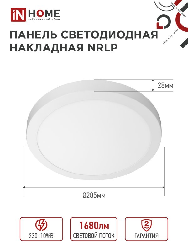 Назначение и применение Панель светодиодная накладная круглая NRLP 24Вт 230В 6500К 1680Лм 285мм белая IP40 IN HOME