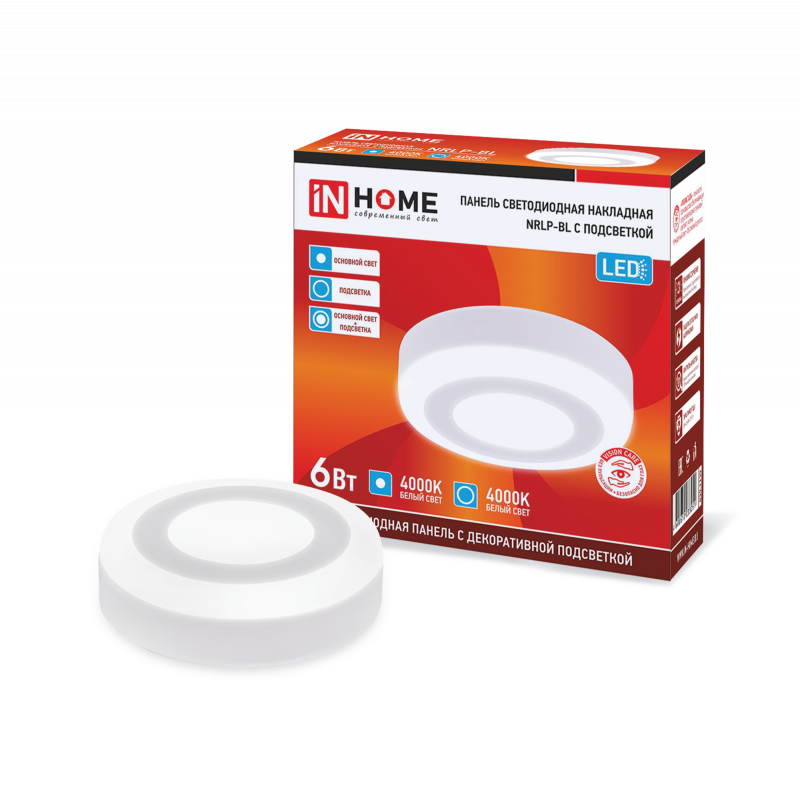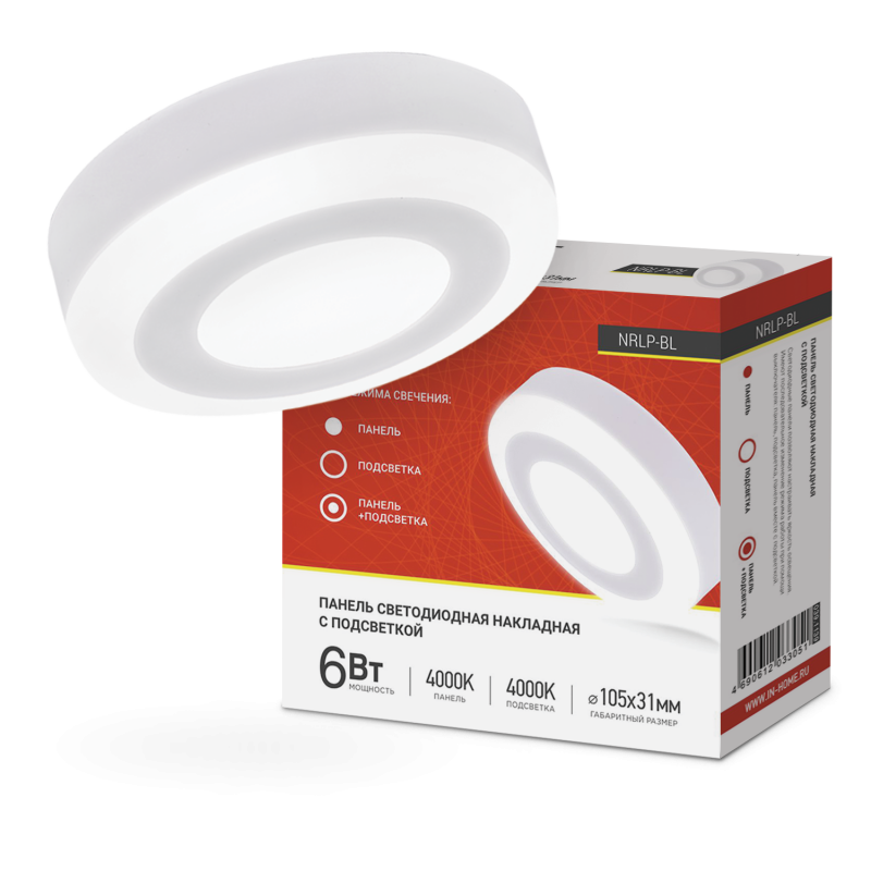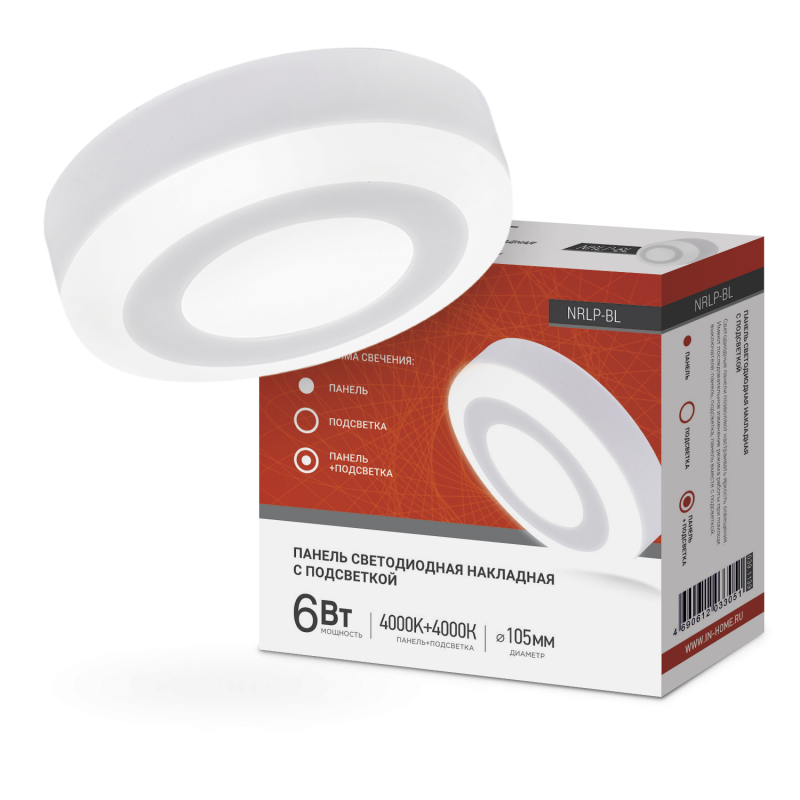 Характеристики Панель светодиодная накладная круглая NRLP-BL 6Вт 230В 4000К 350Лм 105мм с подсветкой белая IP20 IN HOME: