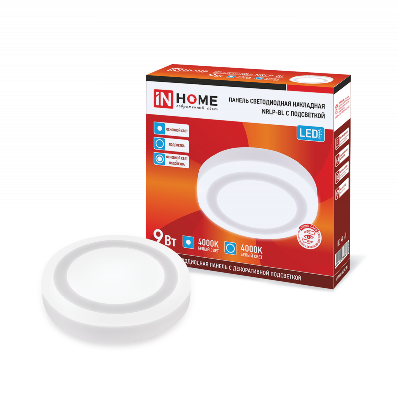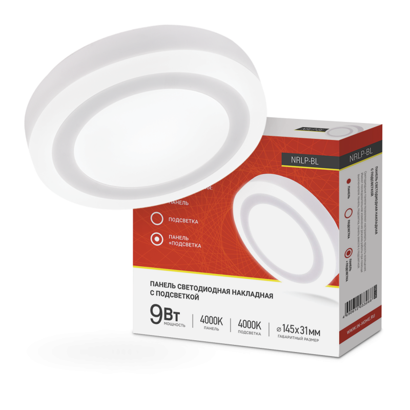 Характеристики Панель светодиодная накладная круглая NRLP-BL 9Вт 230В 4000К 540Лм 145мм с подсветкой белая IP20 IN HOME: