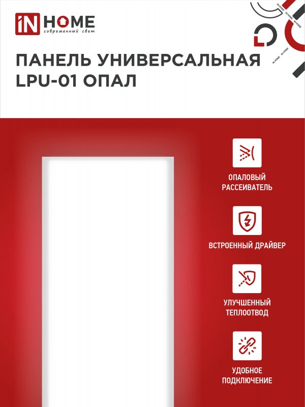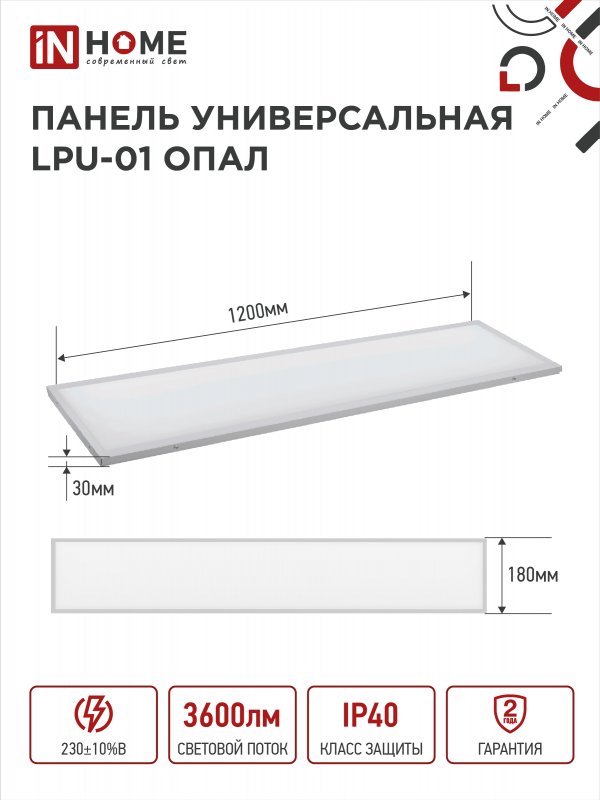 Характеристики Панель светодиодная универсальная LPU-01 40Вт ОПАЛ 230В 4000K 3600Лм 180x1195x30мм IP40 IN HOME: